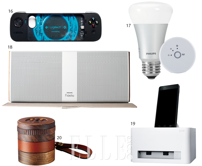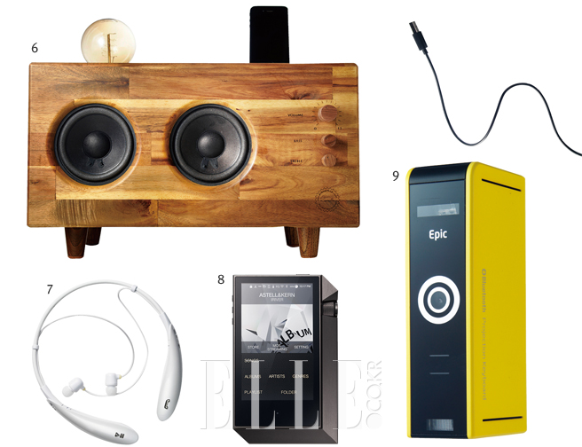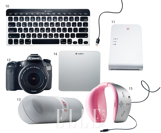 13 BEATS PILL 음악으로 마음을 치유하고자 붙인 이름 필. 알약에서 모티프를 얻었다. 가로 19cm, 세로 5cm도 안 되는 작은 사이즈에서 뿜어내는 사운드가 폭발적이다. 가벼워서 휴대하기에도 좋다. 블루투스 기능이 장착돼 있어 9m 거리의 스마트폰, 노트북 등으로 음악의 트랙 변경 및 볼륨 조절이 가능하다. 29만9천원, 비츠 바이 닥터드레.
