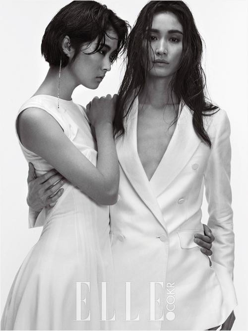 소영이 입은 시어한 이너 웨어와 절개 디테일 롱 드레스는 3백만원대, Dior. 미니 체인 실버 이어 커프는 62만원, V 모티프의 이어 커프는 30만원대, 모두 Louis Vuitton. 세라가 입은 화이트 더블브레스트 수트와 팬츠는 모두 가격 미정, Kimseoryong.