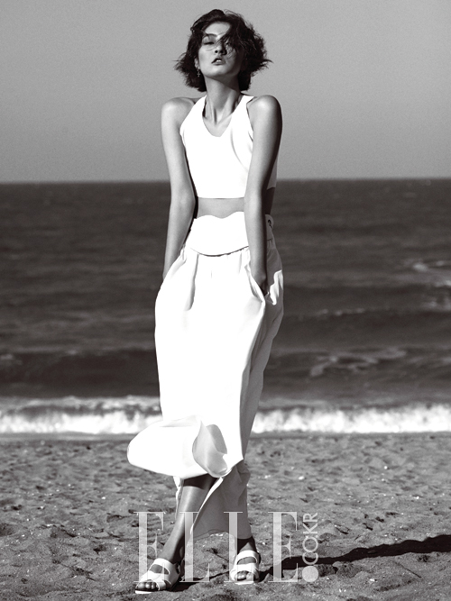 화이트 크롭트 니트 톱은 가격 미정, Calvin Klein Platinum. 화이트 롱스커트는 84만원, 와이드한 레더 벨트는 66만5천원, 화이트 샌들은 가격 미정, 모두 Tod’s.