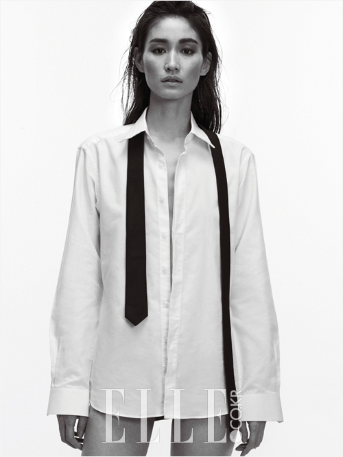 박시한 화이트 셔츠는 18만원, Kwonohsoo Classic. 미니멀한 블랙 타이는 가격 미정, Chanel.