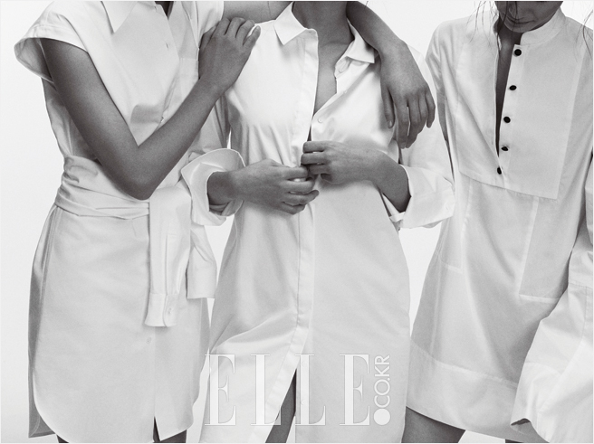 (왼쪽부터) 허리 라인에 묶어 핏을 연출할 수 있는 소매가 달린 슬리브리스 셔츠 드레스는 1백1만원, Moschino. 미니멀한 롱 셔츠는 11만5천원, Cos. 블랙 버튼과 와이드 커프스가 달린 셔츠 드레스는 가격 미정, Alexander McQueen.