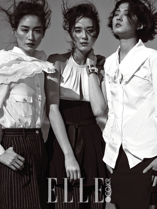 세라가 입은 화이트 레이스와 골드 & 진주 버튼 장식 투 포켓 셔츠와 핀 스트라이프 쇼츠, 승미가 입은 플리츠 홀터넥 배색 톱과 벨트처럼 두른 타이, 핀 스트라이프 와이드 팬츠, 진주 장식이 달린 메탈릭 뱅글은 모두 가격 미정, Chanel. 소영이 입은 와이드 칼라 화이트 셔츠와 구조적인 블랙 스커트는 모두 가격 미정, Maison Margiela.