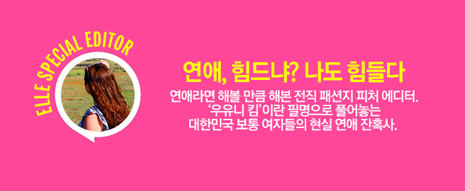 30대 중반. 패션지의 피처 에디터로 일하면서, 연애 해볼 만큼 해봤습니다. 연애 칼럼을 늘 쓰고 싶었어요. 그런데 세상 다 아는 언니처럼 이래라저래라 하기에, 제 연애는 시궁창입니다. 저처럼 연애에 치이고 구른 한국 여성들에게 말해주고 싶어요. 당신만 이렇게 힘든 거 아닙니다! 부끄러움은 제 몫. 저와 제 친구들의 현실적인 경험담이 당신에게 공감 혹은 위로가 되길 바랍니다. 혹시 압니까? 남 일은 잘 보인다고, 당신의 연애에 해답을 얻을지. elle.co.kr에서 매주 수요일 찾아갑니다.