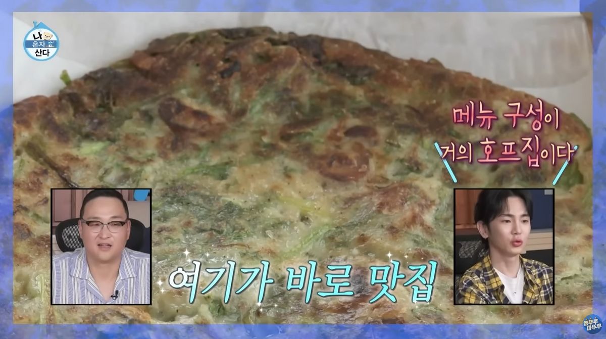 손질해 양푼에 넣어 둔 미나리 위로 다진 청양고추와 씻은 골뱅이, 후추와 다진마늘을 차례로 투하하는 구성환의 손길이 매우 날렵했어요. 과연 오랜 자취 생활로 완성한 '눈대중 레시피'였습니다. 여기에 부침가루를 적당량 넣고 팬에 부치면 되는데요. 보통 전을 부치고 나서 키친타올에 올려 기름을 빼는 경우가 대부분일 겁니다. 이 방법이 가장 간단하고요. 그런데 구성환은 소쿠리에 종이 호일을 까는 방식으로 기름을 빼요. 구성환에 따르면, 전을 부친 뒤 이렇게 처리했을 때 맛이 완전 달라집니다.