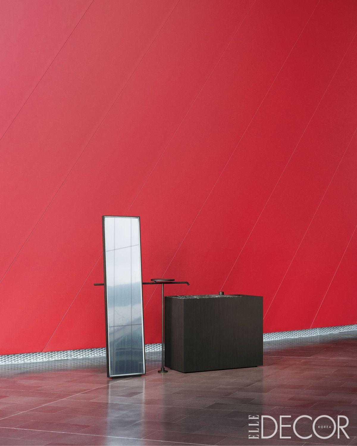 BATHROOM Ma by Foster + Partners for Falper 디자인과 건축을 융합하는 프로젝트의 일환으로 고안된 미니멀하고 세련된 시스템. 기본적으로 서로 평형을 이루는 두 가지 요소가 돋보인다. 대리석 세면대와 필요에 따라 거울을 지지하거나 샤워 볼 또는 수건을 걸 때 사용할 수 있는 출수구의 가느다란 스테인리스스틸 줄기가 이를 방증한다. 다양한 생활공간에 적용할 수 있는 혁신적이고 유연한 작품. falper.it