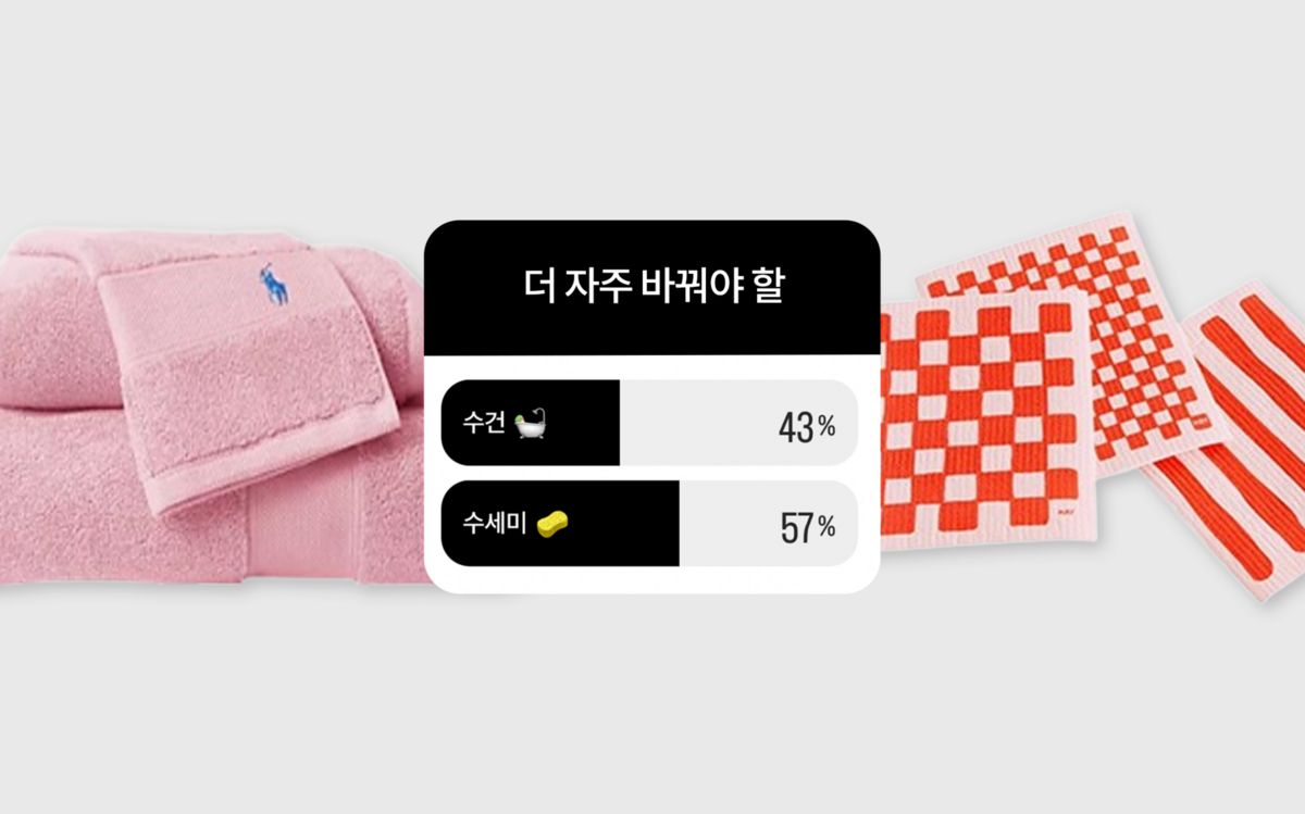<엘르 데코> 인스타그램 팔로워에게 물었습니다. 43%가 수건에, 57%가 수세미에 투표했네요.