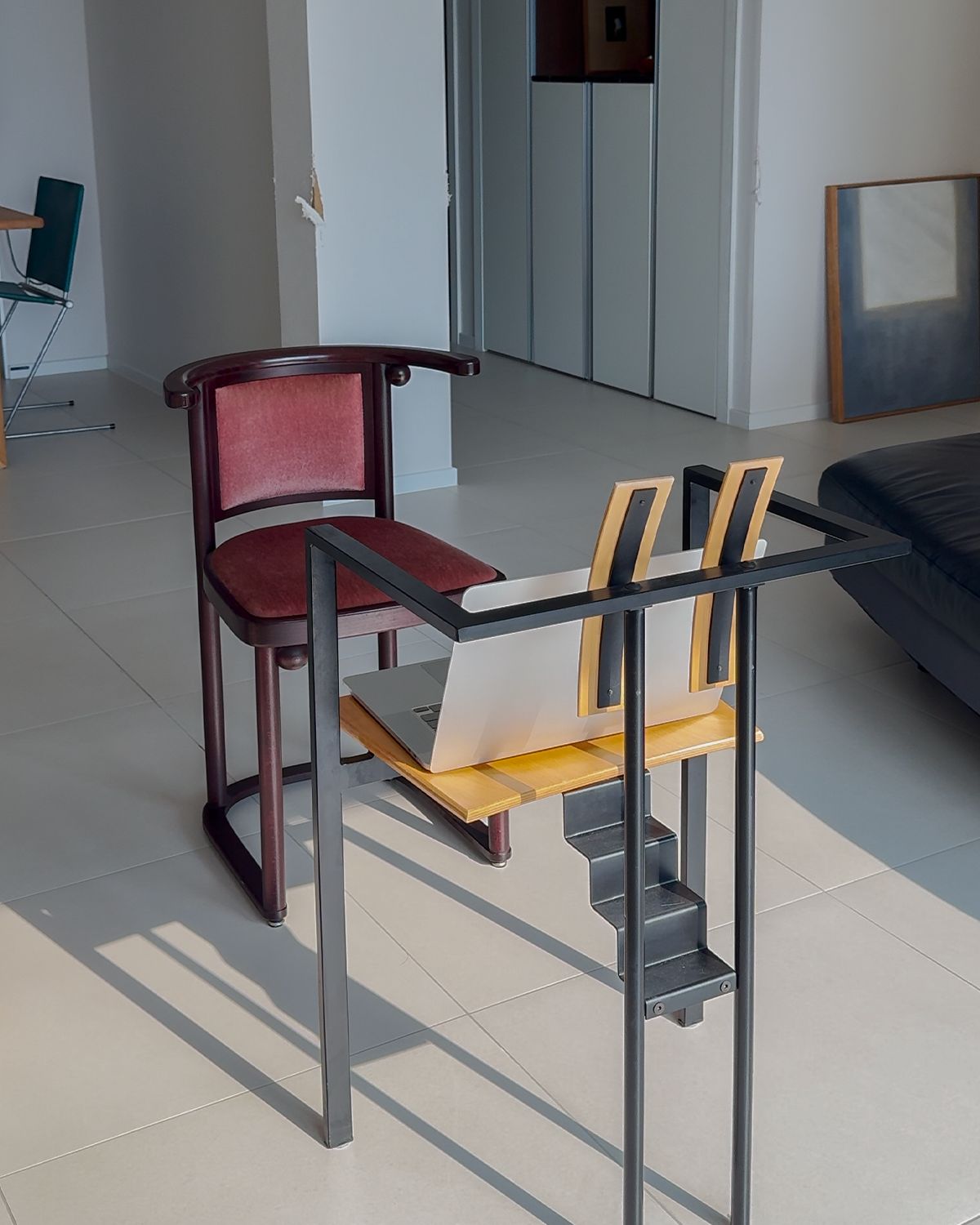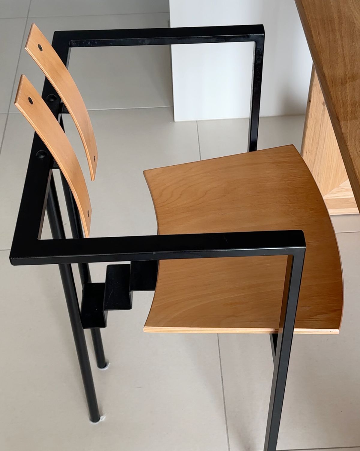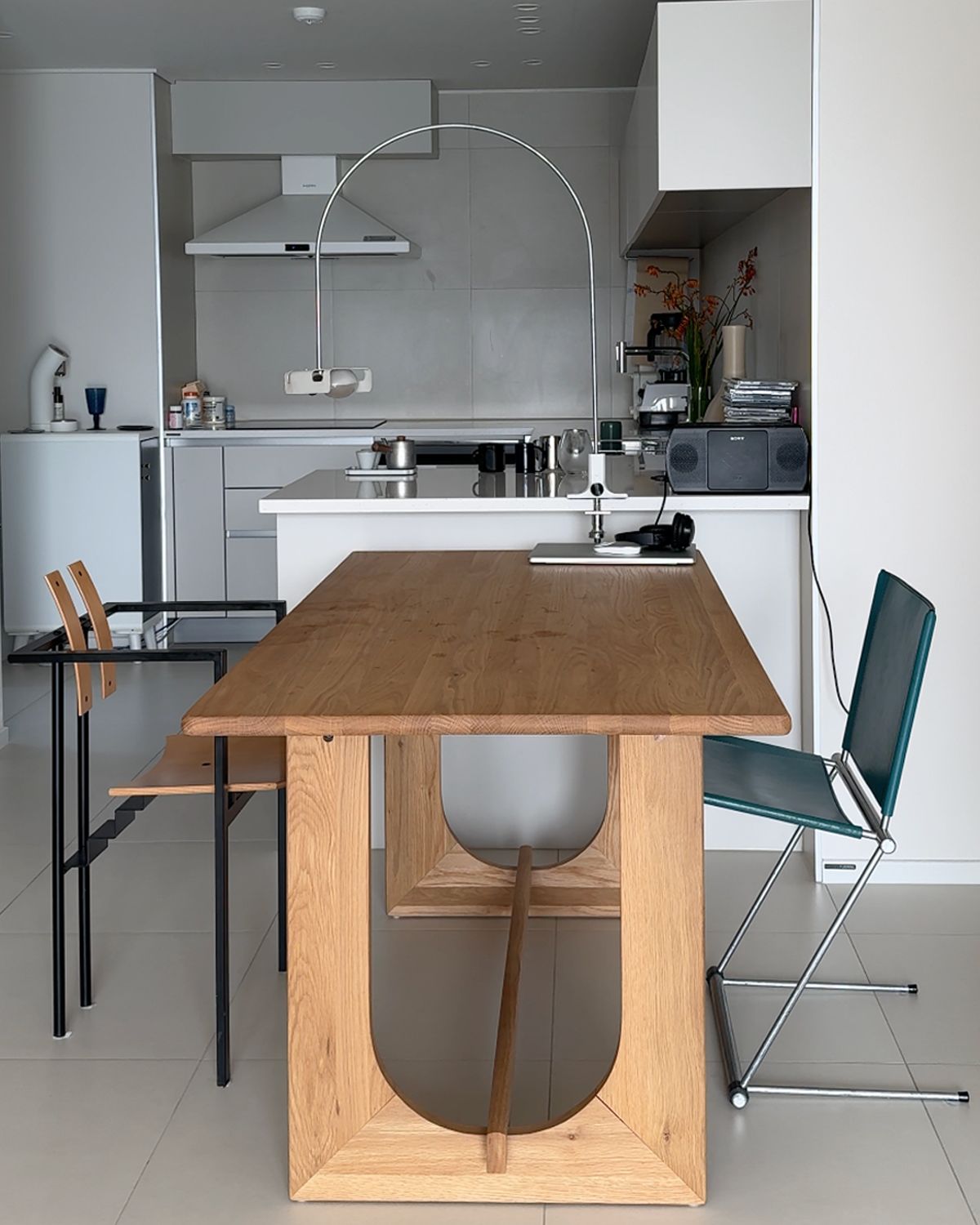 선아의 남편이 사이드 테이블로 사용하기도 하는 해당 의자는 KFF의 트릭스 암체어입니다. 독일에서 생산된 이 가구는 오브제로 느껴질 만큼 생소한 직선들로 이루어져 있어요.