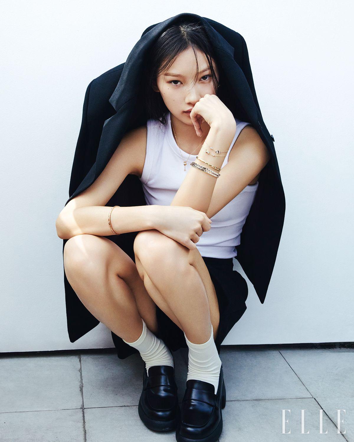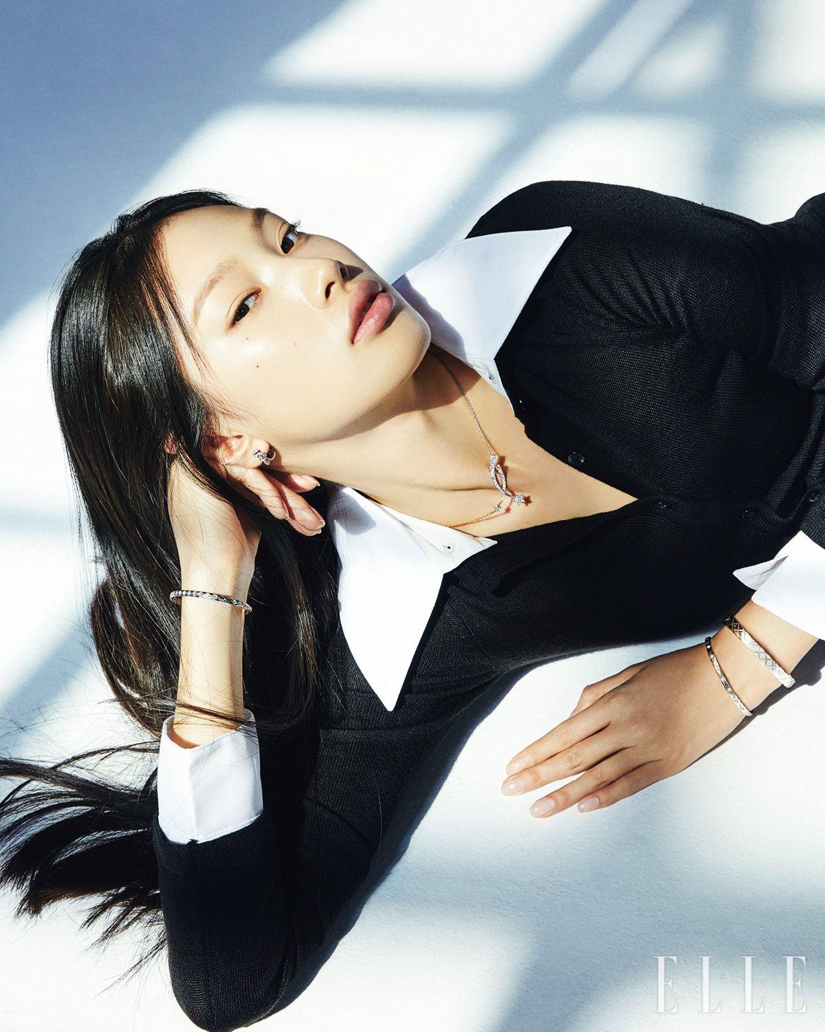 Chanel Fine Jewelry. 오른손에 착용한 18K 화이트골드에 아홉 개의 0.32캐럿 브릴리언트 컷 다이아몬드를 세팅한 코코 크러쉬 미니 브레이슬릿, 18K 화이트골드에 18개의 0.18캐럿 브릴리언트 컷 다이아몬드를 세팅한 이터널 N°5 싱글 이어링, 18K 화이트골드와 18K 옐로골드, 37개의 1.03캐럿 브릴리언트 컷 다이아몬드로 이뤄진 꼬메뜨 네크리스, 왼손에 착용한 18K 화이트골드에 81개의 0.25캐럿 브릴리언트 컷 다이아몬드를 세팅한 코코 크러쉬 브레이슬릿, 다이아몬드를 장식한 18K 화이트골드 코코 크러쉬 미니 브레이슬릿은 모두