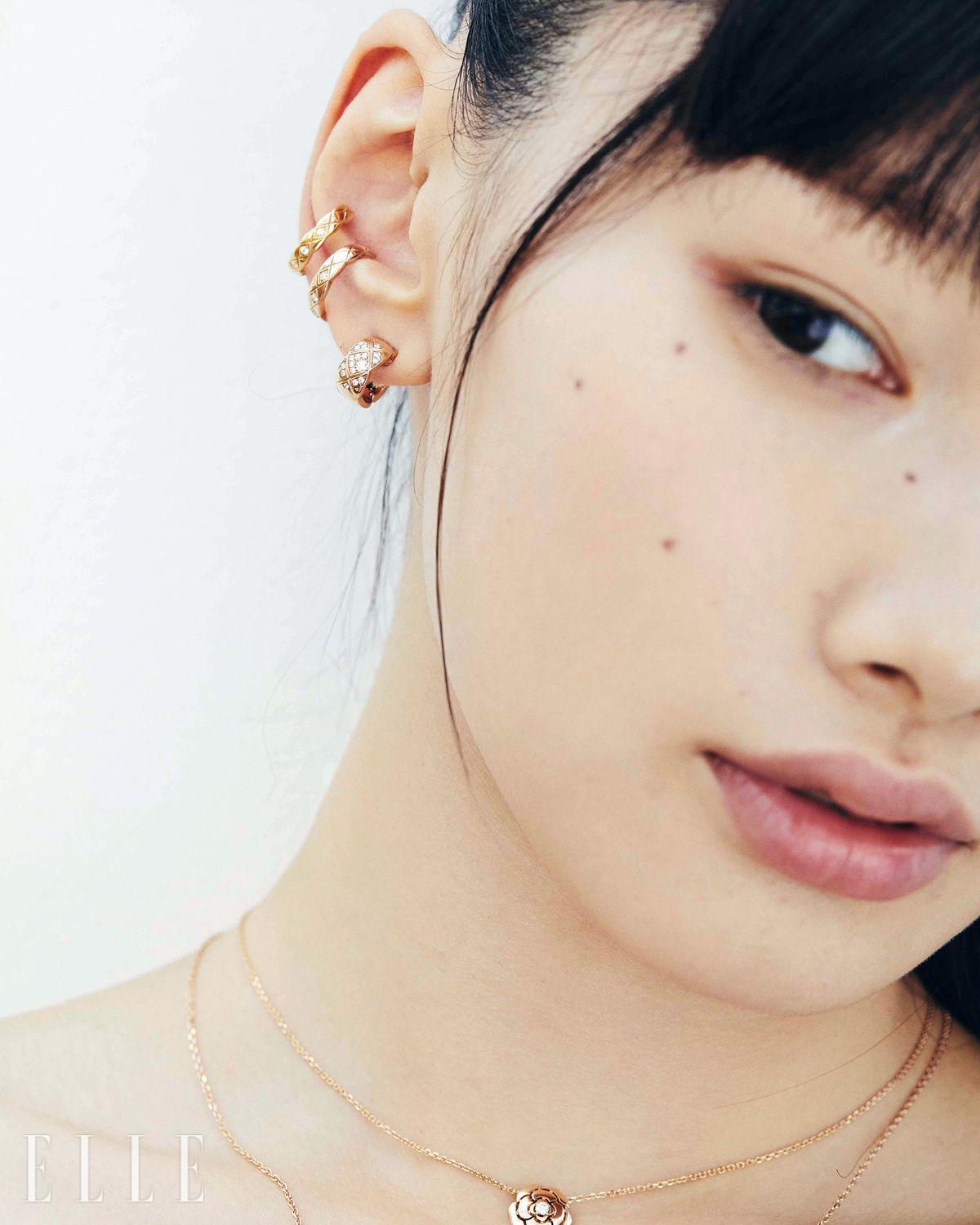 Chanel Fine Jewelry. 다이아몬드 장식의 18K 베이지골드 코코 크러쉬 이어링과 오른쪽 귀에 착용한 18K 베이지골드와 18K 옐로골드 코코 크러쉬 이어링, 18K 베이지골드와 0.05캐럿 브릴리언트 컷 다이아몬드로 이뤄진 까멜리아 네크리스, 다이아몬드를 장식한 18K 베이지골드 엑스트레 드 N°5 네크리스는 모두