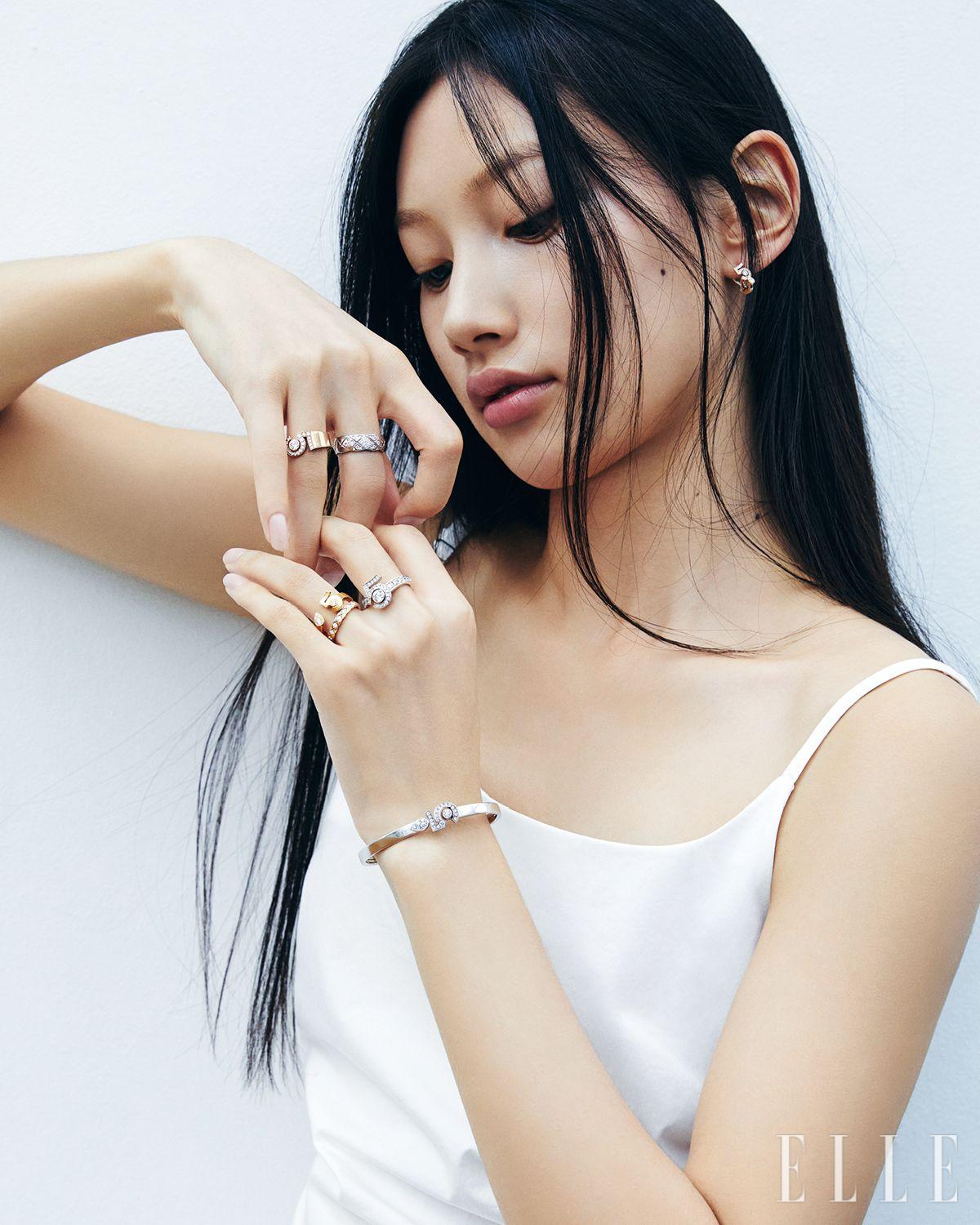 Chanel Fine Jewelry. 오른손 검지에 착용한 18K 옐로골드에 60개의 0.85캐럿 브릴리언트 컷 다이아몬드를 세팅한 코코 크러쉬 스몰 링과 약지에 착용한 18K 옐로골드에 31개의 0.18캐럿 브릴리언트 컷 다이아몬드를 세팅한 코코 크러쉬 스몰 링, 다이아몬드가 장식된 18K 옐로골드 코코 크러쉬 미니 링, 왼손 검지에 착용한 다이아몬드를 세팅한 18K 베이지골드 이터널 N°5 링, 중지에 착용한 53개의 0.44캐럿 브릴리언트 컷 다이아몬드를 세팅한 18K 베이지골드 코코 크러쉬 라지 링, 약지에 착용한 다이아몬드를 세팅한 18K 베이지골드 코코 크러쉬 미니 링, 18K 옐로골드에 다섯 개의 0.16캐럿 브릴리언트 컷 다이아몬드를 세팅한 엑스트레 드 N°5 링, 18K 베이지골드와 다이아몬드로 이뤄진 엑스트레 드 N°5 네크리스는 모두