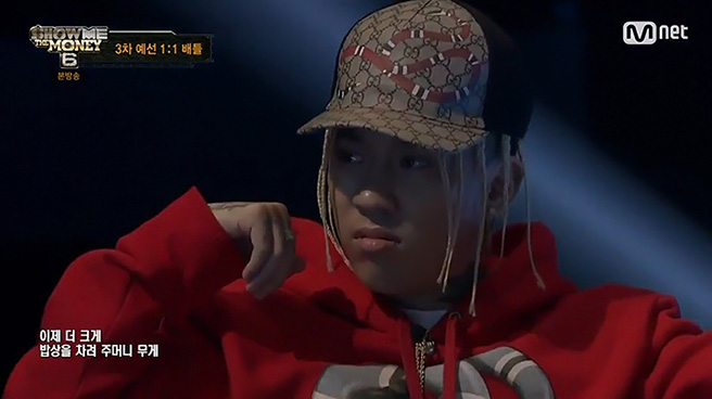 쇼미더머니 시즌4 심사 중인 도끼가 구찌 모노그랩 캡과 후디를 착용했다.