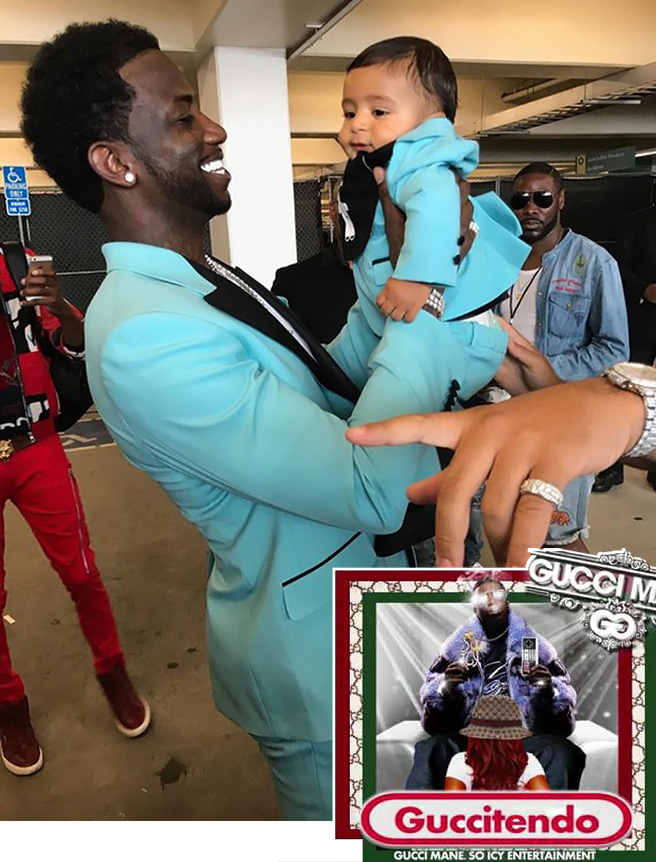 구찌 컬렉션을 입고 2017 BET AWARDS에 참석한 구찌 메인과 그의 데모테잎 ‘구찌 텐도’ 재킷.
