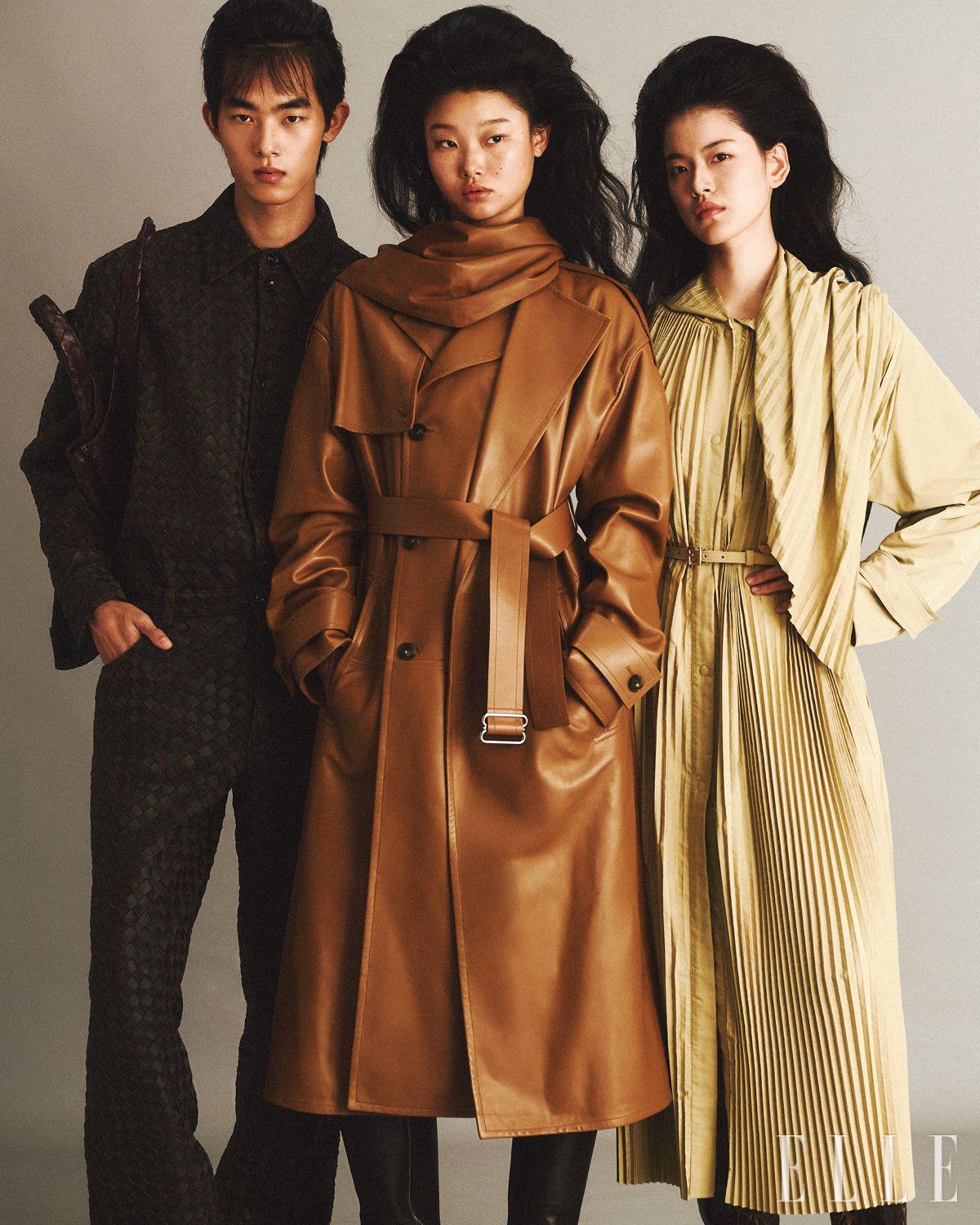 허웨이가 입은 인트레치아토 셔츠와 팬츠, 캄파나 백은 가격 미정, 모두 Bottega Veneta. 윤영이 입은 레더 트렌치코트와 스카프, 니하이 부츠는 가격 미정, 모두 Tod's. 치에가 입은 플리츠 드레스와 벨트, 부츠는 가격 미정, 모두 Fendi.
