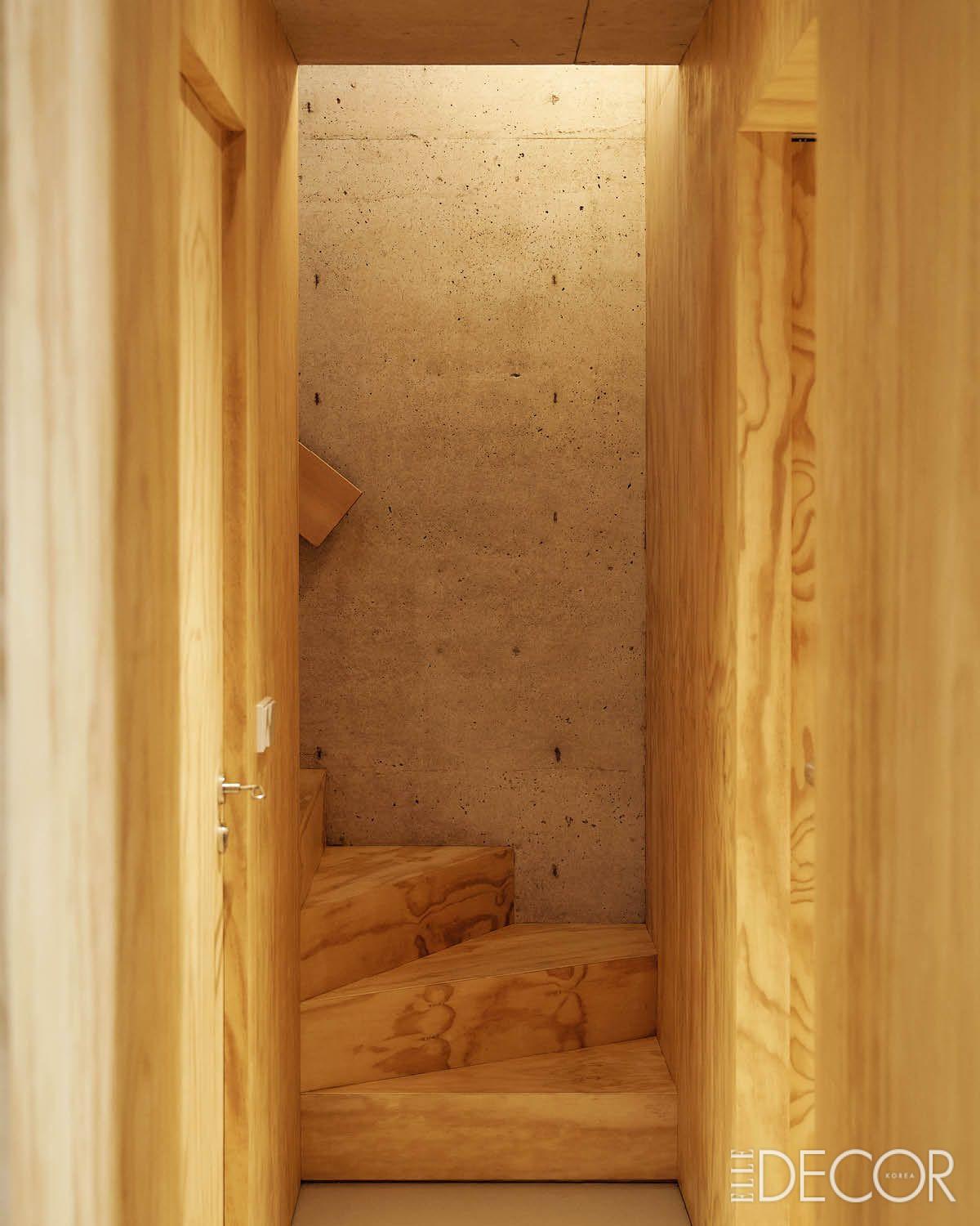 집에 들어서면 가장 먼저 눈에 들어오는 것은 천장을 가로지르는 조명. 잉고 마우러의 ‘야야호(Yayaho)’다. 금속 와이어 위에 떠 있는 듯한 이 조명은 직선과 곡선이 공존하는 섬세한 구조로 공간에 긴장감을 만든다. 단순히 ‘꾸밈’을 위한 조형물이 아니라, 공간을 구성하는 첫 번째 재료 같다. 조명 설치를 위해 구할 수 없는 부속을 직접 깎아가며 하나하나 제작했다. 커튼 레일 역시 시중에서 구할 수 있는 제품으로는 만족하지 못해 스테인리스를 접어 직접 만들고 슬라브 안쪽으로 숨겼다. 이렇듯 기능과 감도를 결합시킨 디테일에 이 집이 추구하는 태도가 있다. 집의 내벽 전체는 합판과 노출 콘크리트로 마감했다. 두 가지의 상반되는 질감이 자연스럽게 어우러져 인상적이다. 합판은 제주 바다를 연상시키는, 물결무늬가 진한 소재를 선택했다. 제주라는 장소성과 이곳의 기후, 작가의 조형 언어를 함께 고려한 결과물이다. 합판은 이 집의 피부처럼 모든 공간을 잇고 흐르게 만든다.
