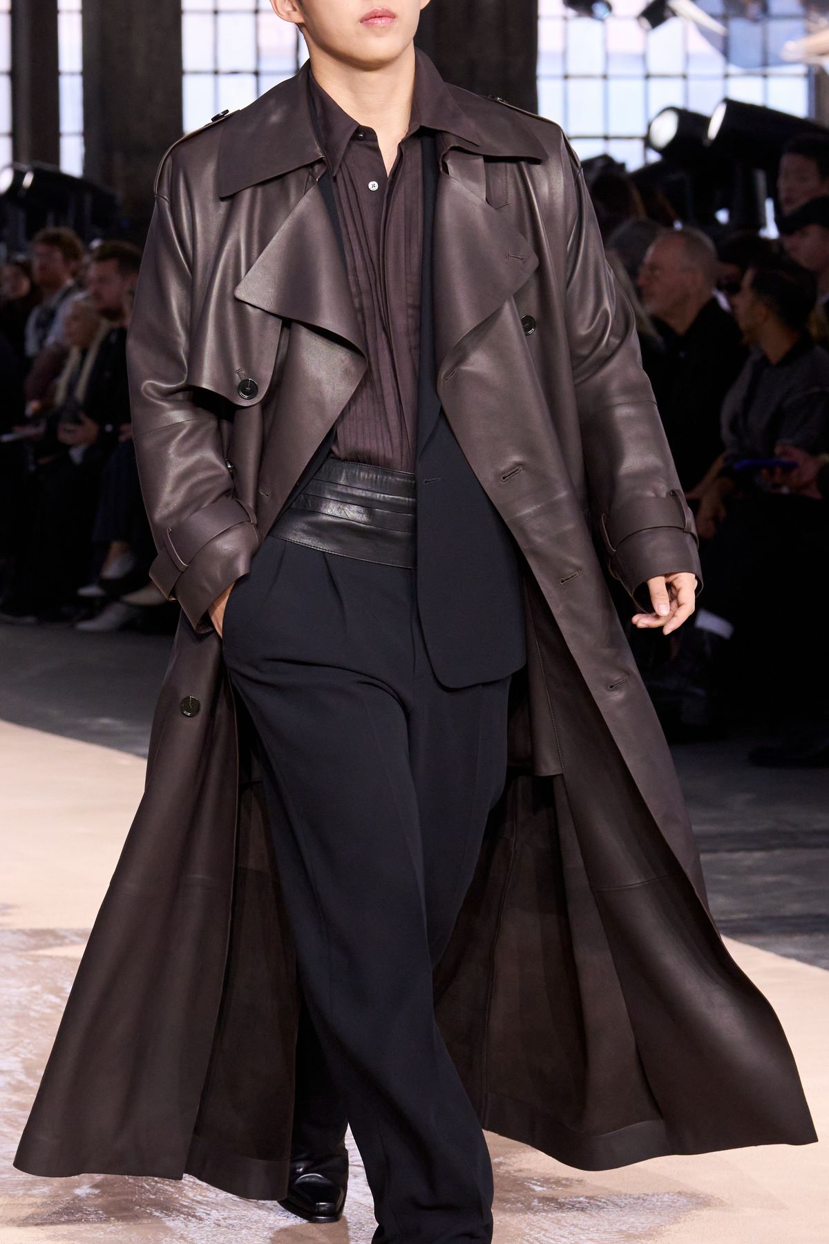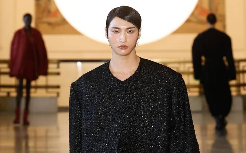 에스쿱스는 갈색 레더 트렌치코트에 블랙 셔츠와 팬츠를 매치한 룩으로 등장했습니다. 묵직한 가죽 소재가 주는 강렬한 분위기와, 단정한 올블랙 스타일링이 어우러져 세련된 카리스마를 완성했죠. 두 손을 주머니에 넣고 당당히 걸어 나오는 모습은, 첫 무대임에도 불구하고 노련한 모델의 아우라를 풍겼습니다. 어느덧 데뷔 10년차를 맞이한 아티스트의 노련미가 느껴지는 순간이었죠.