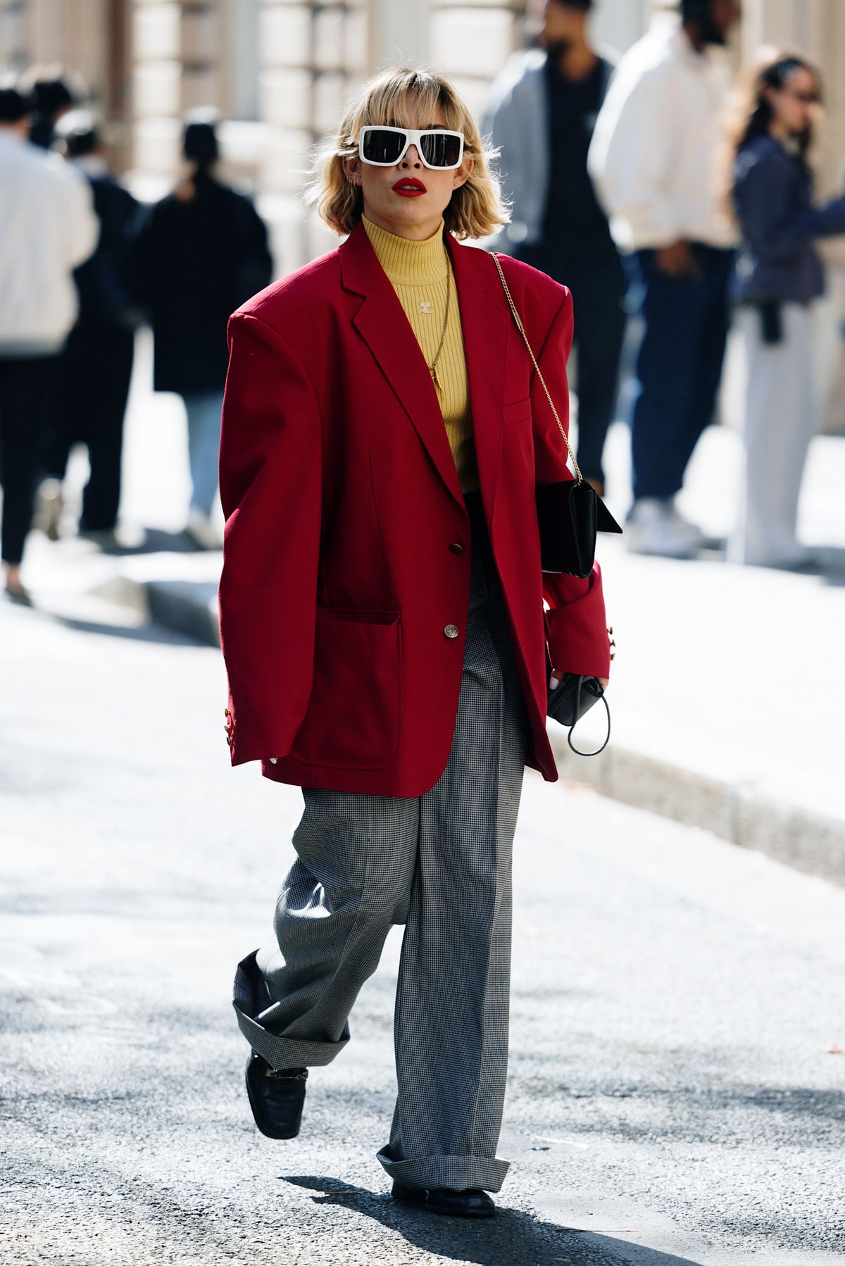 잿빛 도시 한복판에 불시착한 듯한 레드 자켓은 그 자체만으로도 영화적인 장면을 만들어냅니다. 회색 와이드 팬츠를 만나니 레트로한 무드가 펼쳐지고, 여기에 복고풍 선글라스와 레드립까지 더해지니 한층 드라마틱한 장면이 탄생했죠. 밝은 옐로 톱으로 컬러 대비를 극대화해 룩에 생기를 불어넣는 것이 핵심입니다.