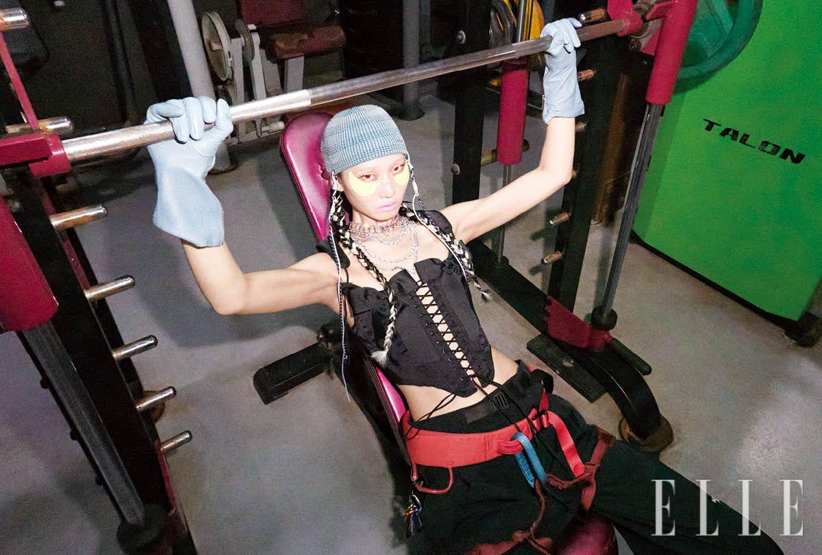 레이어드한 네크리스는 2백40만원, Swarovski. 보 코르셋 톱은 65만원, Gyouree kim. 비니는 10만8천원, Atiissu. 레더 장갑은 11만9천원, H&M Studio. 패러수트 팬츠는 13만8천원, The North Face. 하네스는 11만원, Black Diamond.