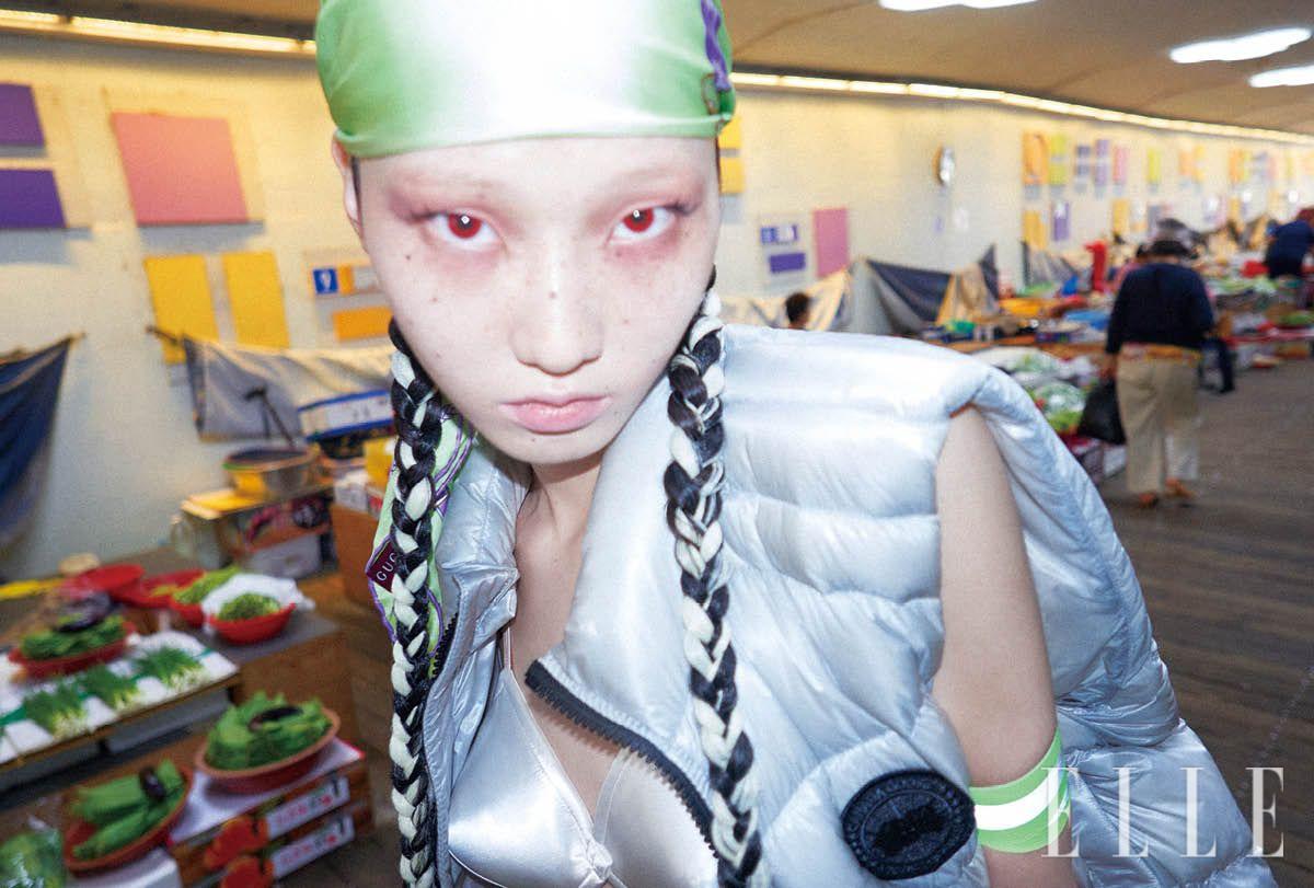 패딩 베스트는 1백만원, Canada Goose. 브라톱은 가격 미정, Miu Miu. 그린 스카프는 가격 미정, Gucci.암 스트랩은 에디터 소장품.