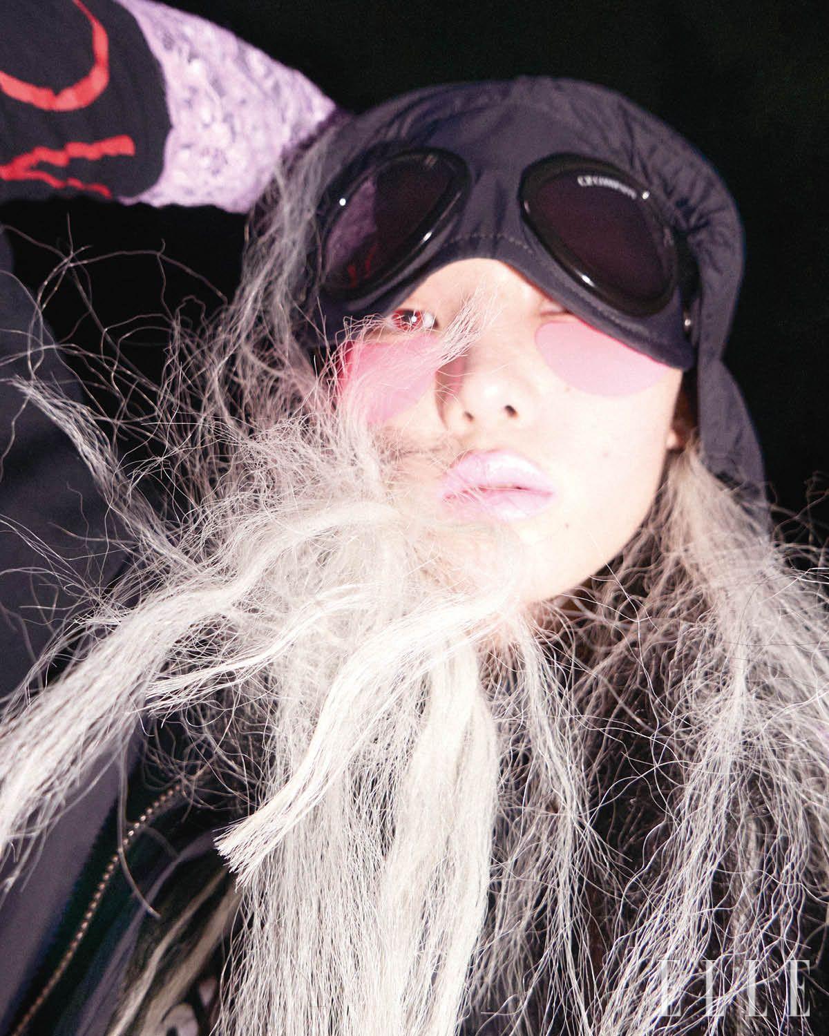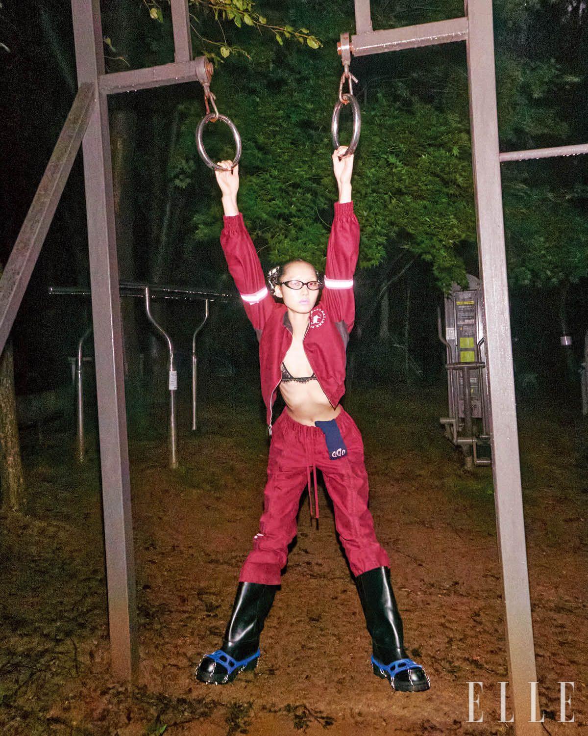 트랙 재킷은 4백55만원, 트랙 팬츠는 4백5만원, 모두 Enfants Riches Déprimés. 레이스 브라톱은 가격 미정, Dolce & Gabbana. 안경은 39만8천원, Gentle Monster. 바지에 장식한 양말은 1만4천원, Odd Socks. 레더 부츠는 29만 9천원, H&M. 부츠에 단 아이젠, 암 스트랩은 에디터 소장품.