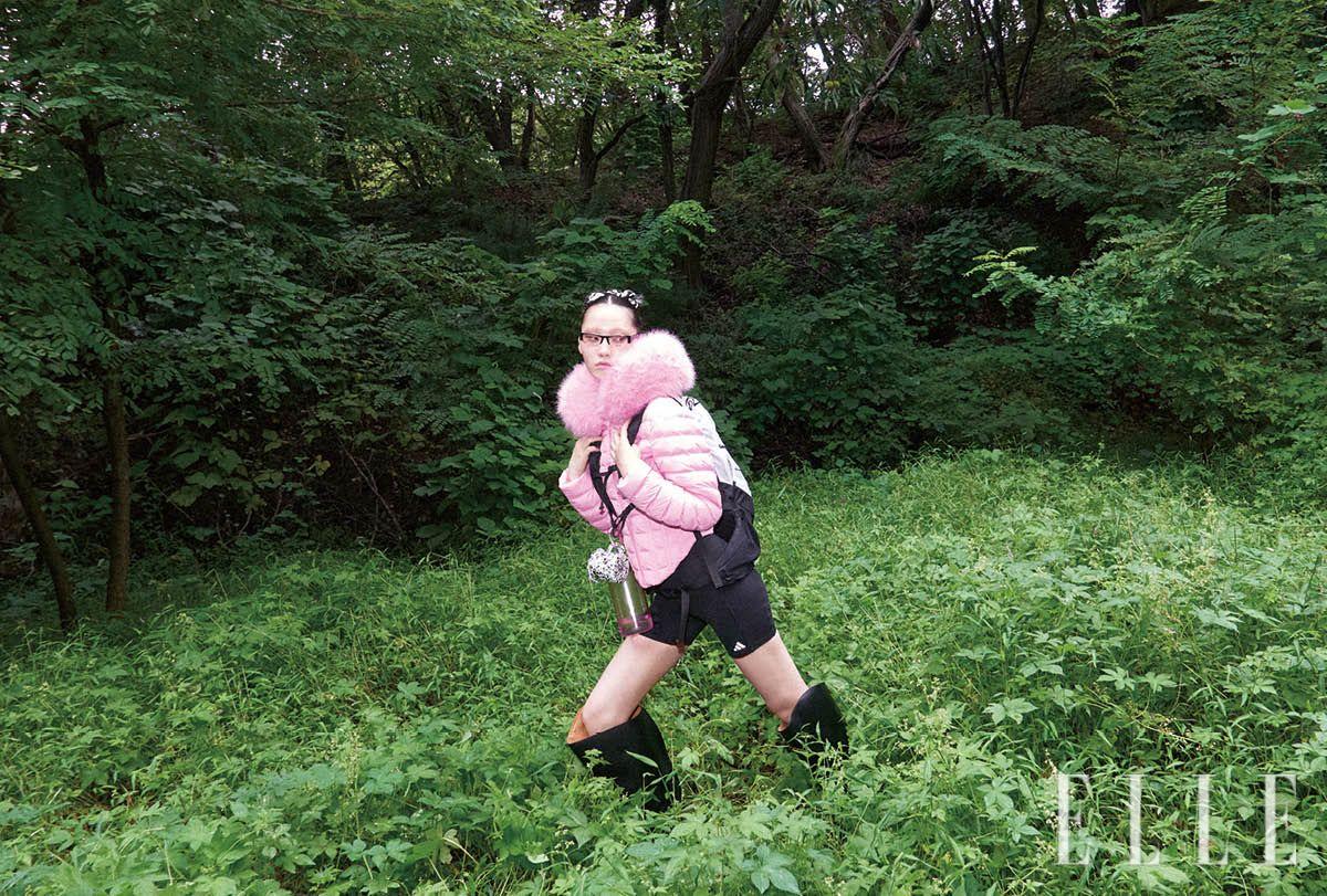 고어텍스 재킷은 62만원, Kolon Sport. 레이스 슬리브리스 톱은 가격 미정 Chloé. 쇼츠는 85만원, Alexanderwang. 실버 프레임의 선글라스는 43만원, Gentle Monster. 메달 펜던트 네크리스는 가격 미정, Balenciaga. 보 펜던트 네크리스와 롱 펄 네크리스는 가격 미정, 모두 Chanel. 퍼 부츠는 2백만원대, Fendi. 등산 스틱과 카라비너, 다리에 찬 스트랩은 에디터 소장품.