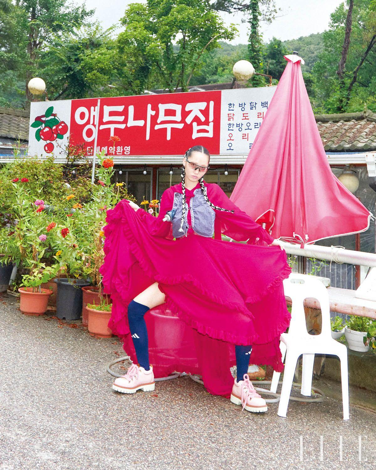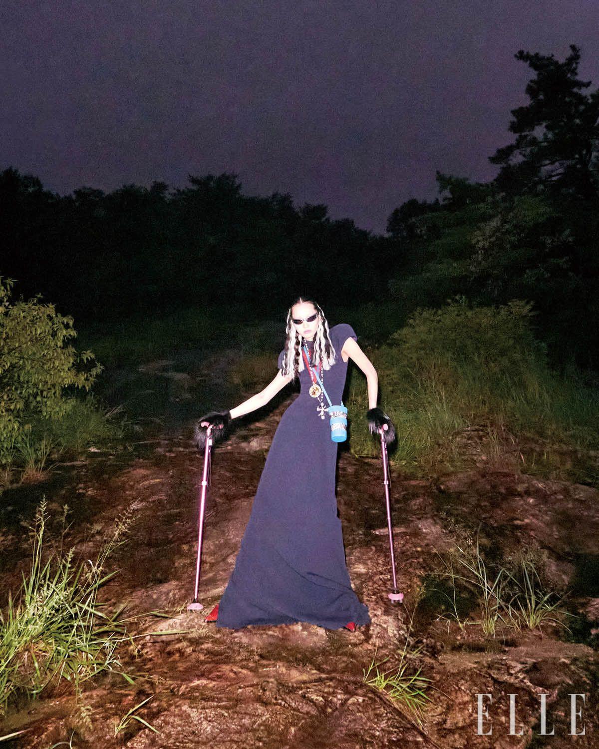 퍼프 맥시 드레스는 가격 미정, Juun. J. 메달 펜던트 네크리스는 가격 미정, Balenciaga. 십자가 펜던트 네크리스는 1백88만원, Blumarine. 보틀 홀더 백은 가격 미정, Hermès. 레이스업 슈즈는 가격 미정, McQueen. 핑거리스 퍼 장갑은 가격 미정, Valentino Garavani. 실버 프레임의 선글라스는 43만원, Gentle Monster. 등산 스틱은 에디터 소장품.