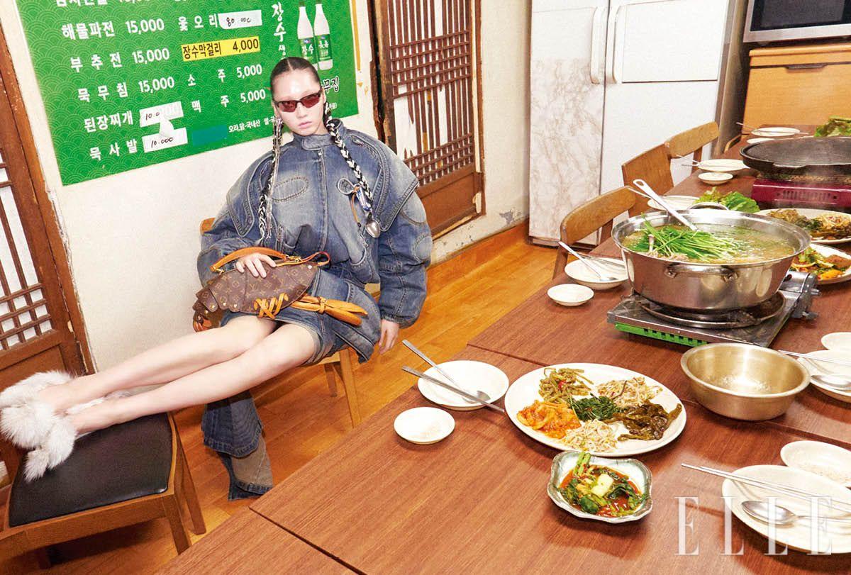 오버사이즈 데님 재킷과 맥시스커트는 가격 미정, 모두 Juun. J. 고글 선글라스는 가격 미정, Oakely. 해바라기 모티프의 드롭 이어링은 가격 미정, McQueen. 로브스터 모티프의 백은 가격 미정, Louis Vuitton. 퍼 펌프스는 가격 미정, Mark Gong. 재킷에 매단 캠핑용 숟가락과 카라비너는 에디터 소장품.