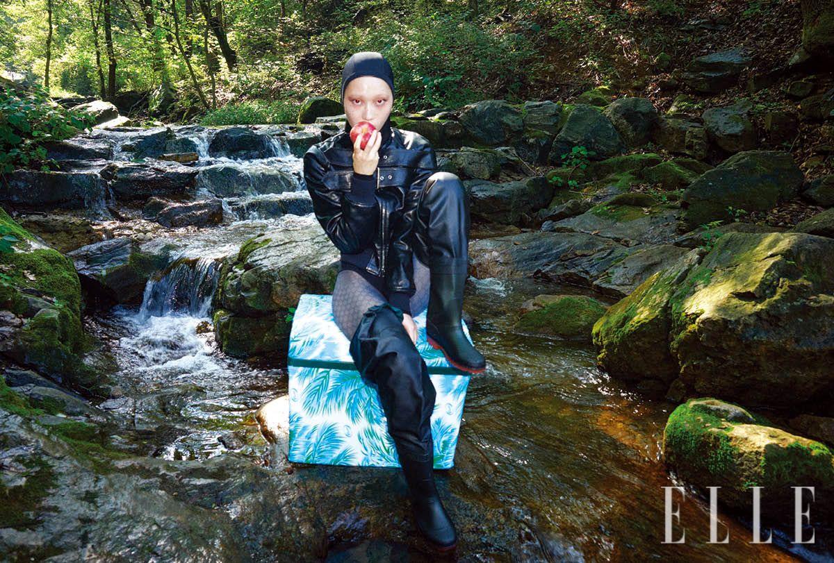 레더 재킷은 가격 미정, McQueen. 터틀넥 보디수트는 가격 미정, Loro Piana. 바라크라바는 가격 미정, Valentino Garavani. 로고 타이츠는 가격 미정, Gucci. 방수 부츠는 에디터 소장품.