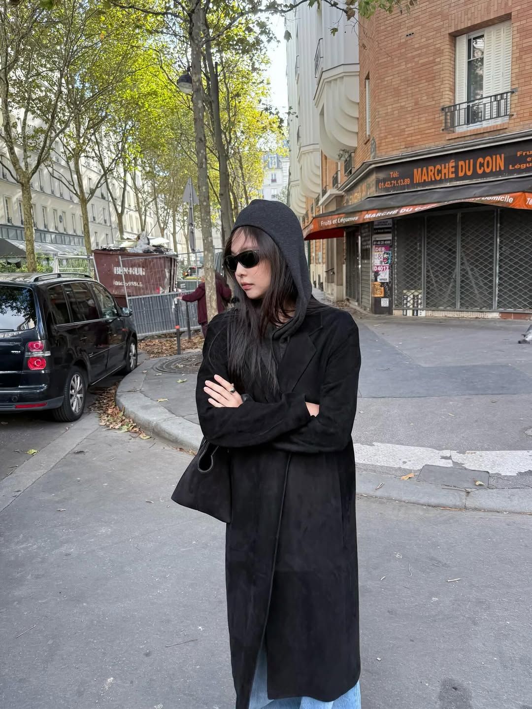 10월의 파리는 쌀쌀함 그 자체. 제니는 길이와 실루엣이 다른 다양한 아우터로 청바지 룩을 완성했습니다. 블랙 스웨이드 코트에 귀여운 니트 했을 매치한 룩은 적당히 캐주얼하면서도 스틸레토 힐로 마무리해 클래식한 분위기를 더했죠.