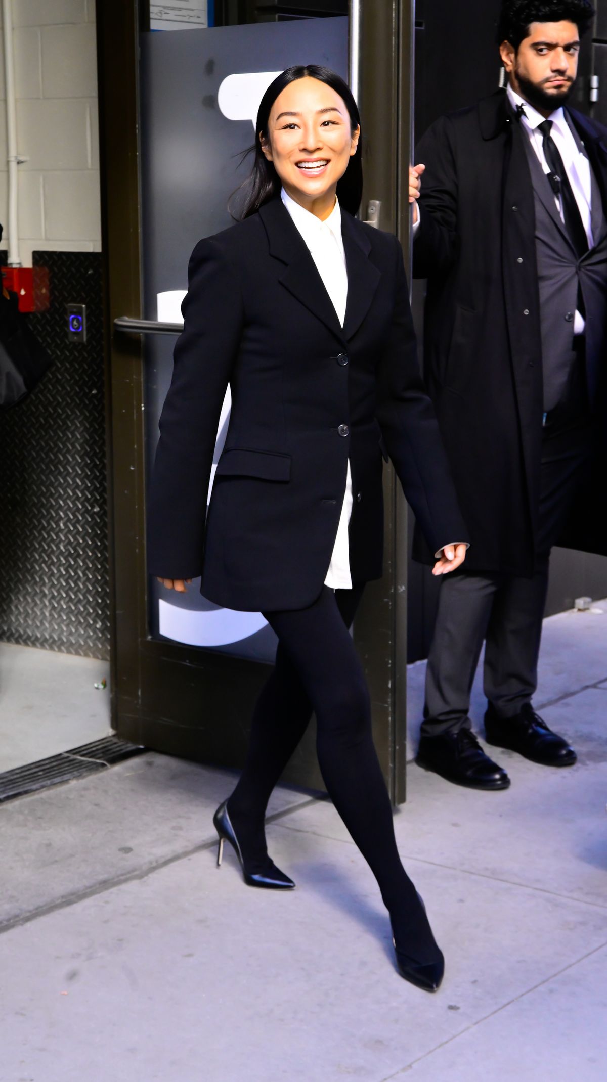 오후 일정에서 그레타 리는 더 로우의 블랙 슈트로 완전히 다른 분위기를 보여줬어요. 허리를 강조한 블레이저와 레깅스처럼 착 달라붙는 바지, 그리고 구두까지 하나로 연결된 디자인은 강렬하면서도 정제된 인상을 줍니다. 화이트 셔츠의 삼각 밑단이 재킷 아래 살짝 드러나도록 연출한 것도 포인트였죠.