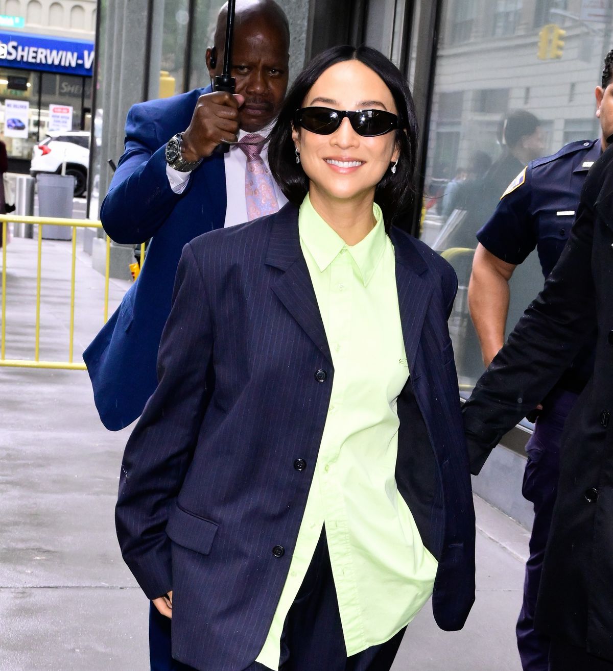 아침 방송 ‘Live With Kelly and Mark’에 등장한 그레타 리는 스틸 켈리라는 브랜드의 네이비색 투톤 수트를 선택했습니다. 은은한 핀스트라이프 패턴의 오버사이즈 블레이저와 통이 넓은 바지 위에, 네온색 셔츠를 매치해 컬러 대비의 묘미를 살렸죠. 셔츠의 하단 단추를 살짝 풀어 밑단을 드러내는 디테일은 의외의 반전 포인트라 매력적입니다.
