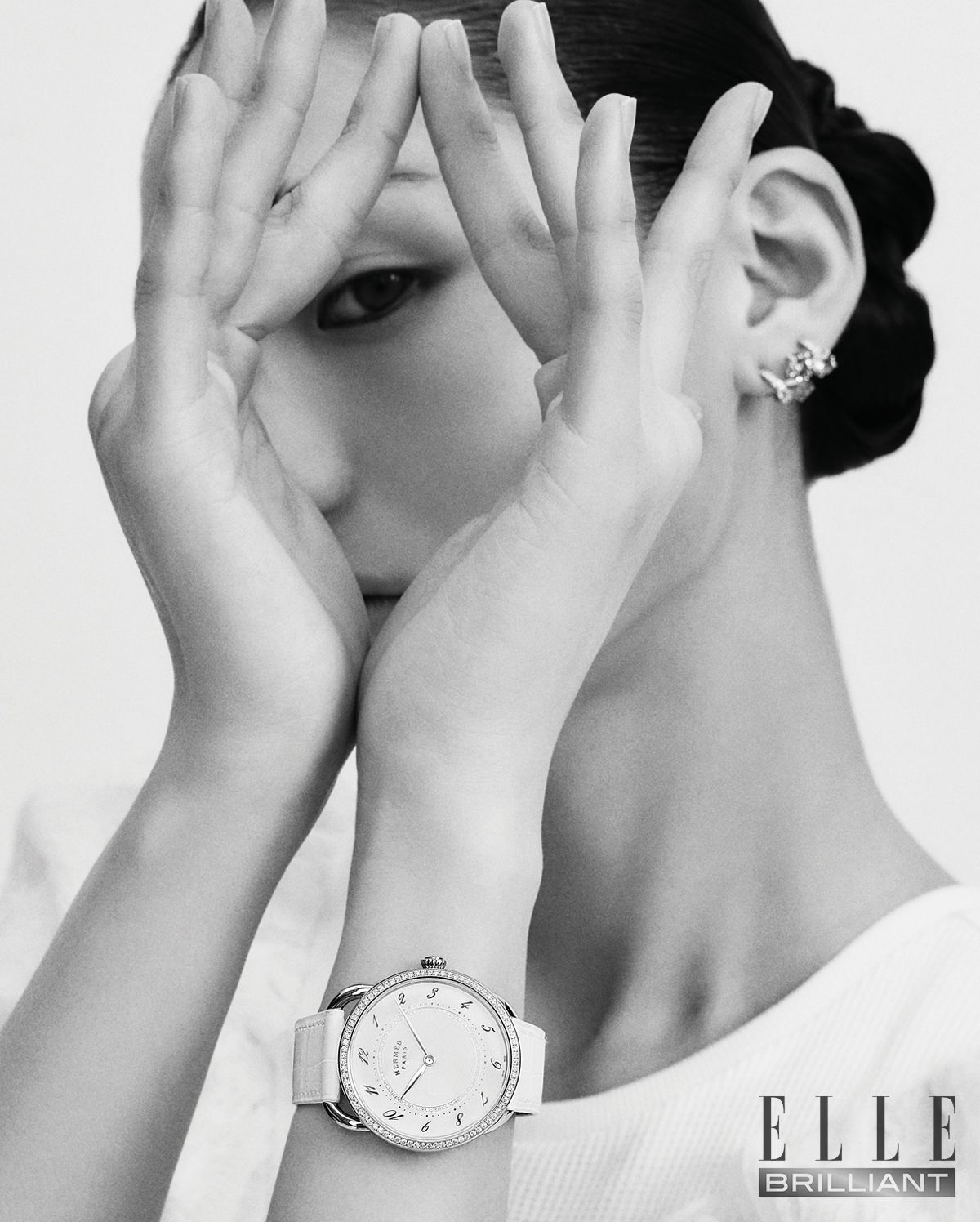 화이트 골드에 아코야 진주와 다아이몬드를 세팅한 ‘밸런스 플러스 네오 다이아몬드 파베 펜던트’ 네크리스는 가격 미정 TASAKI. 화이트 골드에 다이아몬드를 세팅한 ‘마크리 클래시카’ 브레이슬릿은 1천8백만원대 BUCCELLATI. 케이스에 다이아몬드를 세팅한 ‘에이치 아워’ 워치는 가격 미정 HERMÈS WATCH. 시폰 드레스와 화이트 스커트는 모두 가격 미정 HANACHA STUDIO. 슈즈는 가격 미정 FERRAGAMO.
