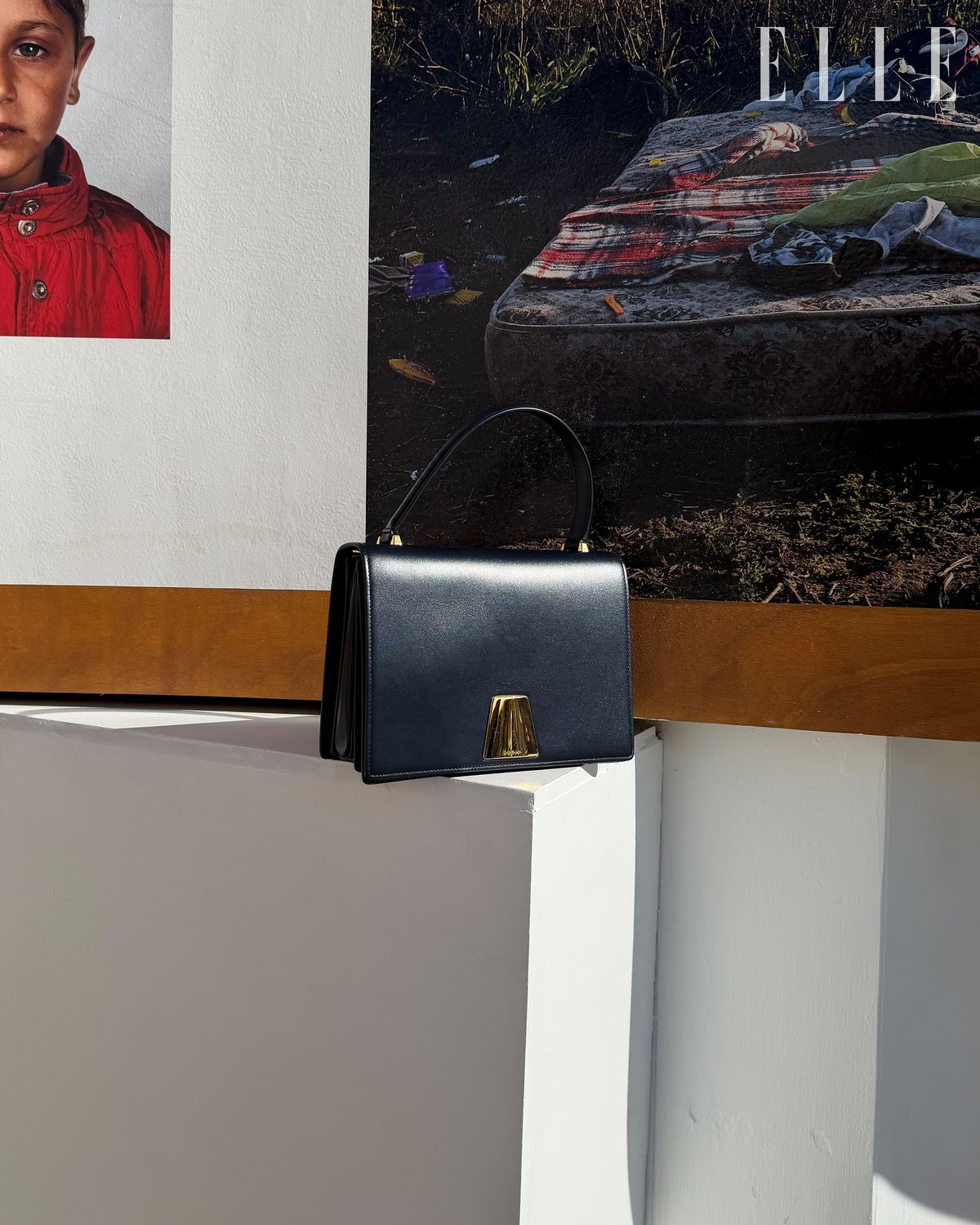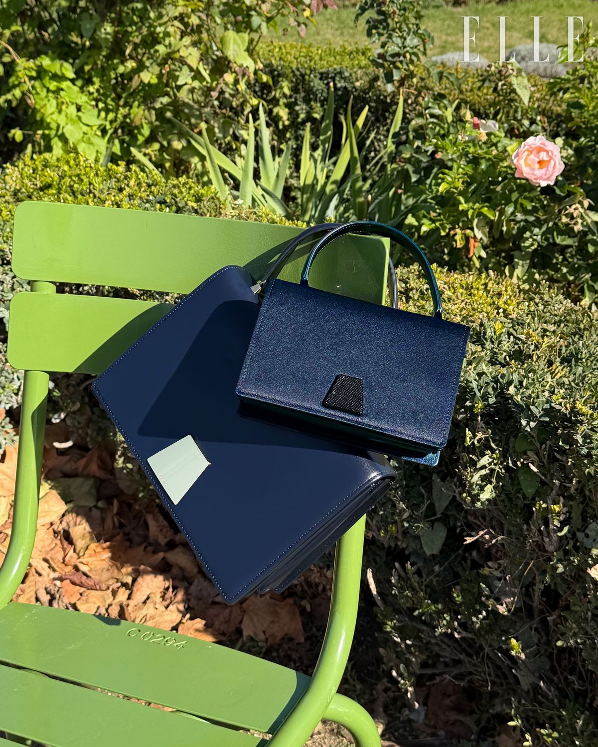 데님 미디움 앨리스 백은 4백 90만원, 네이비 새틴 미니 엘리스 백은 3백 50만원, 모두 Akris.