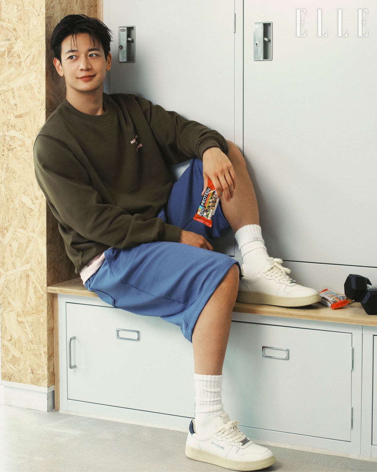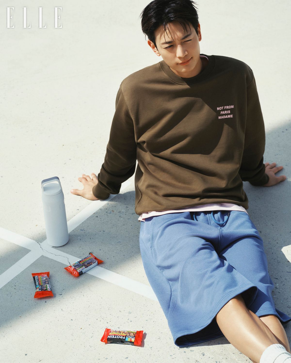 스웨트셔츠는 Drole De Monsieur. 이너 핑크 티셔츠는 Ofcoursewhynot. 버뮤다 스웨트팬츠는 Matin Kim. 삭스는 스타일리스트 소장품.