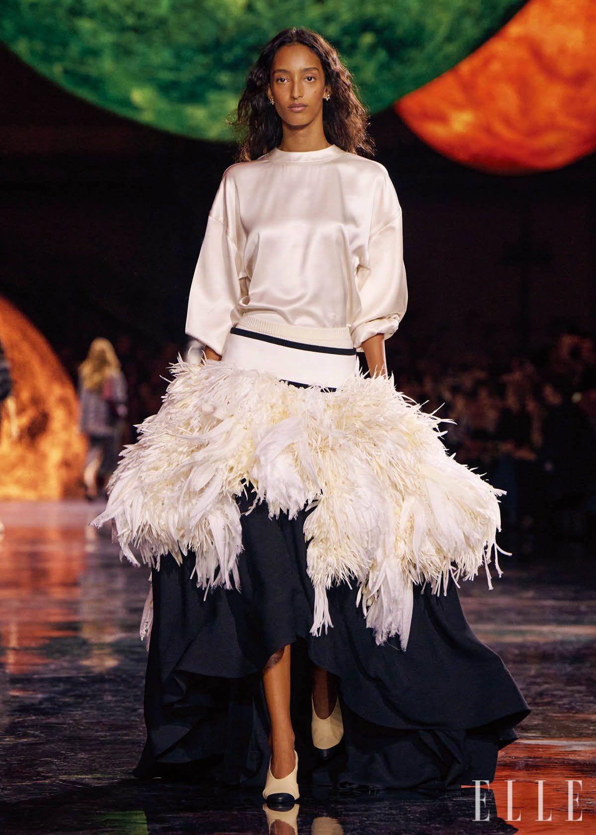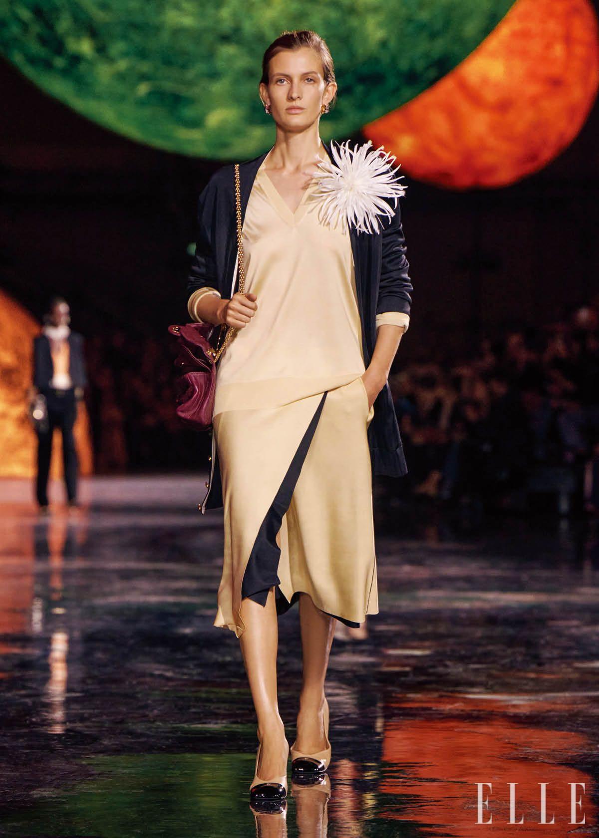 하우스의 건축적 요소 또한 이번 컬렉션에서 돋보이는 대목. 아르데코 양식과 샤넬의 정밀한 패키지에서 영감을 받은 블랙 & 화이트의 간결한 그래픽 라인은 유려한 니트 실크로 풍성하게 표현됐다. 또 플로럴 모티프가 추상적 형태로 피어나며 핸드페인팅된 프린트로 묘사된다.