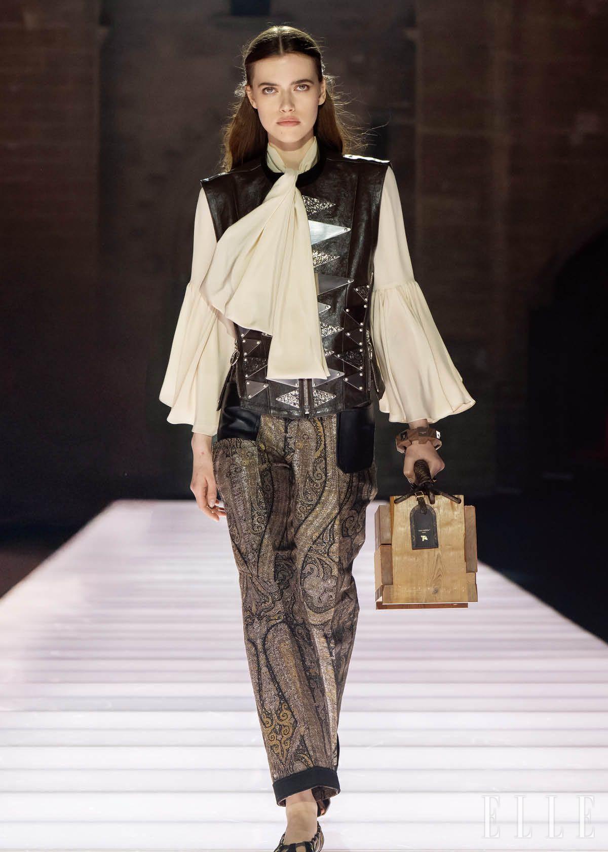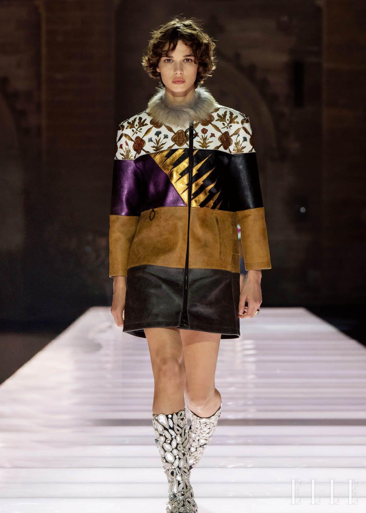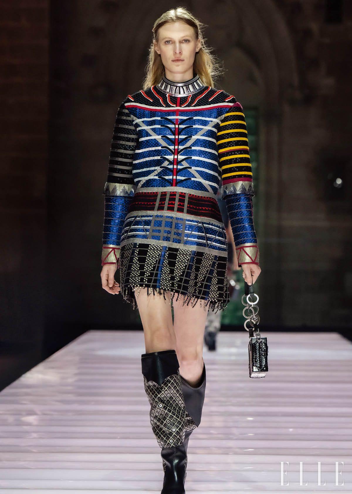먼저 45개의 룩을 선보이는 방식은 무대 구성부터 달랐다. 객석과 무대를 뒤바꿔 관객이 무대에 앉고, 무대가 객석이 되게 한 것이다. “관객을 무대 위에 세우고 싶었어요. 공연하는 사람이 보는 시선에서 관객이 모든 걸 바라보게 하고 싶었죠.” 쇼 시작 전에 제스키에르가 말했다. ‘옛날 옛적에….’로 시작하는 디즈니 애니메이션의 도입부처럼 웅장한 음악이 흐르고 핀 조명이 비탈진 객석을 비추며 쇼가 시작됐다. 잔 다르크를 떠오르게 하는 모델은 방패가 연상되는 견고한 가죽 드레스를 입고 바람을 가르며 등장했다.