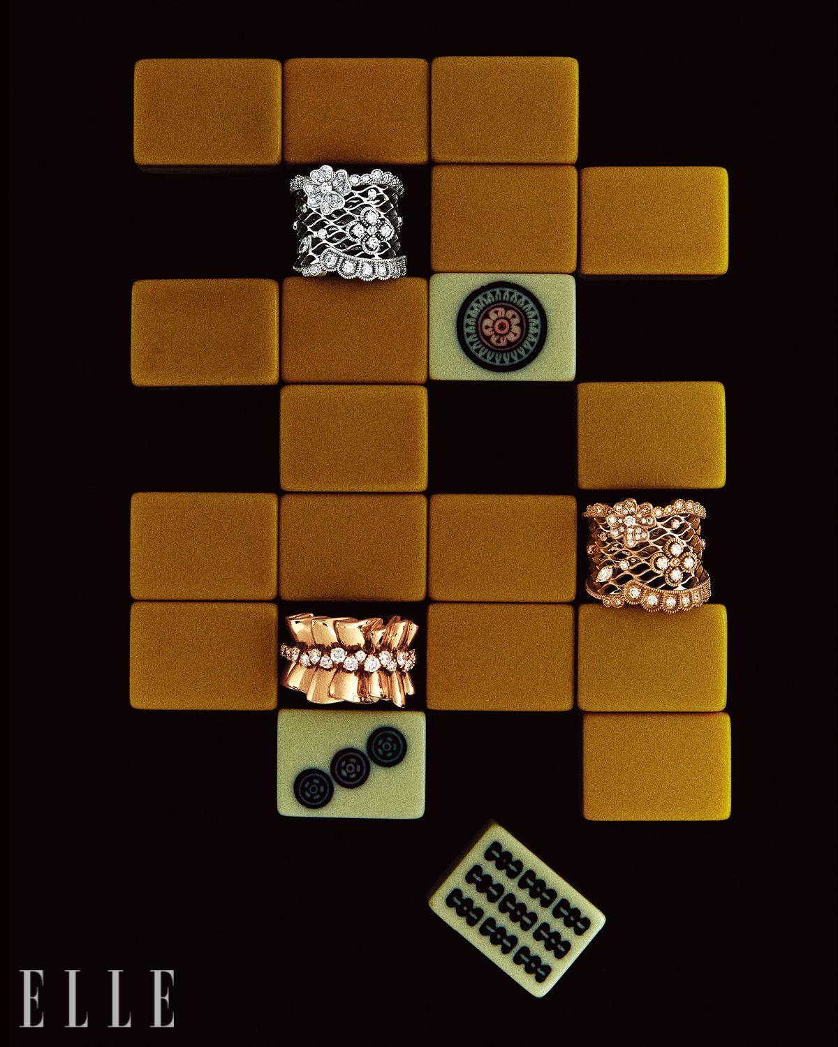 화이트골드에 다이아몬드를 세팅한 꾸뛰르 디올 링과 플라워 모티프에 다이아몬드를 세팅한 핑크골드 꾸뛰르 디올 링, 원단을 접은 것 같은 주름 디테일에 다이아몬드를 세팅한 꾸뛰르 디올 링은 모두 Dior Joaillerie.