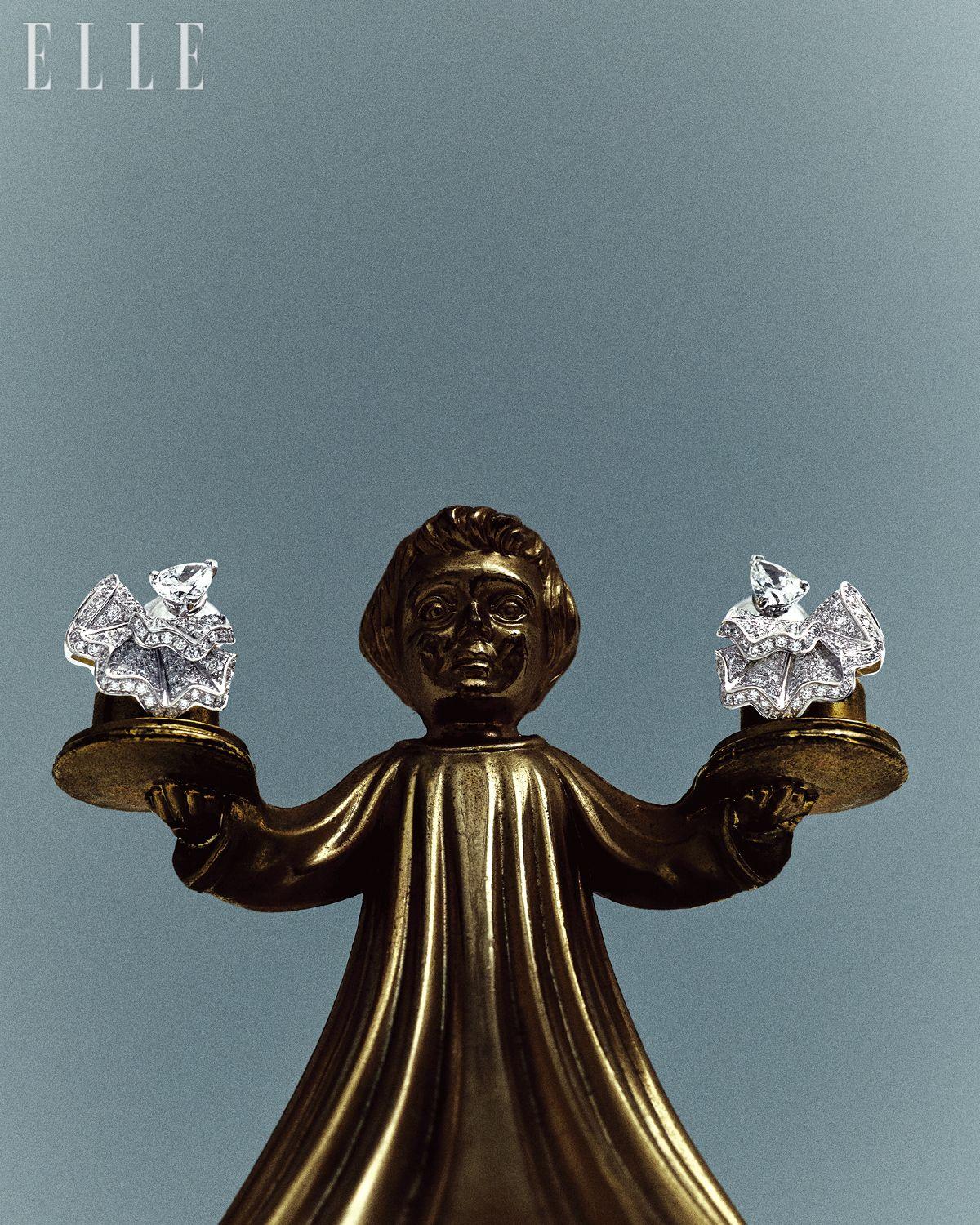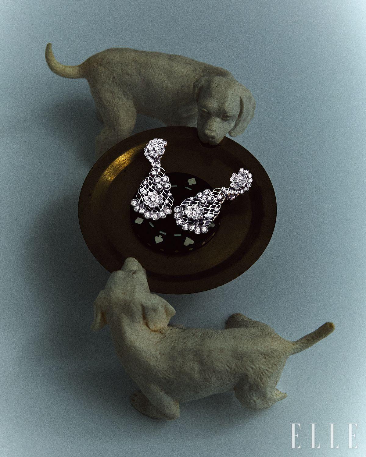 화이트골드에 다이아몬드를 세팅한 꾸뛰르 디올 이어링은 Dior Joaillerie.