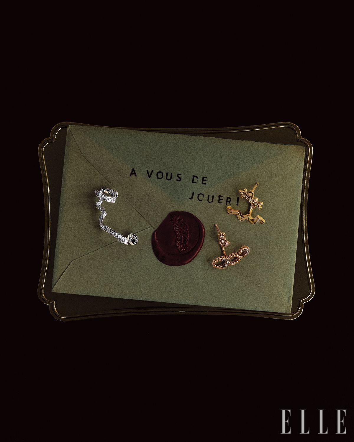 화이트골드에 다이아몬드를 세팅한 꾸뛰르 디올 이어 커프, 핑크골드와 옐로골드에 다이아몬드를 세팅해 서로 다른 실루엣으로 완성한 갈롱 디올 이어링은 모두 Dior Joaillerie.