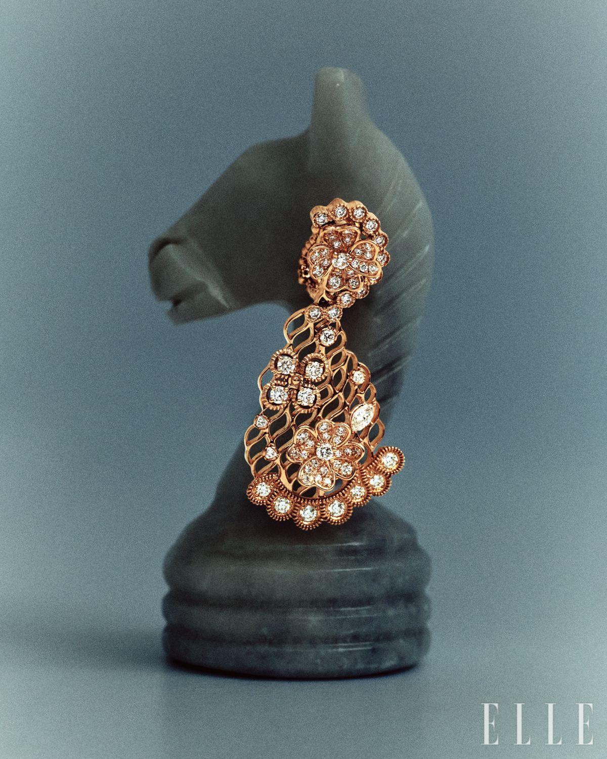 핑크골드에 다이아몬드를 세팅한 레이스 모티프의 꾸뛰르 디올 이어링은 Dior Joaillerie.