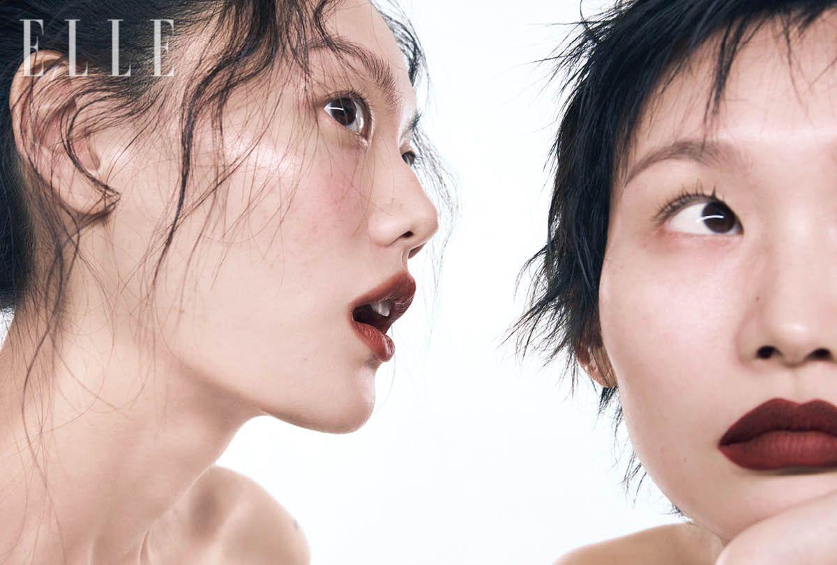 」여성들의 당당한 목소리, 이를 담아내고 증폭시켜 더 많은 여성에게 전하는 <엘르>. 그리고 그 속에서 피어나는 여성들의 연대. 개성 넘치는 컬러를 입술에 바른 아라와 루루, 주원은 저마다 보이스를 전하고, 듣고, 생각하며 깊은 공감을 나눈다. 아라의 입술에는 짙은 바이올렛빛의 Hermès Beauty 루즈 에르메스 샤이니 립스틱, 90 프루느와를 꽉 채워 바르고, 루루의 립에는 구운 아몬드 브라운 톤의 SimiHaze Beauty 벨벳 블러 매트 립 밤, 12 더스크를 스머징하듯 터치했다. 주원은 탁한 버건디빛을 띤 Chanel 루쥬 알뤼르 벨벳 틴트, 232 랑베르쌍뜨를 입술에 정교하게 발색한 뒤, 파우더를 얹어 매트하게 마무리했다. 피부는 톤과 결만 내추럴하게 보정해 시선이 온전히 입술에 머물도록 했다.