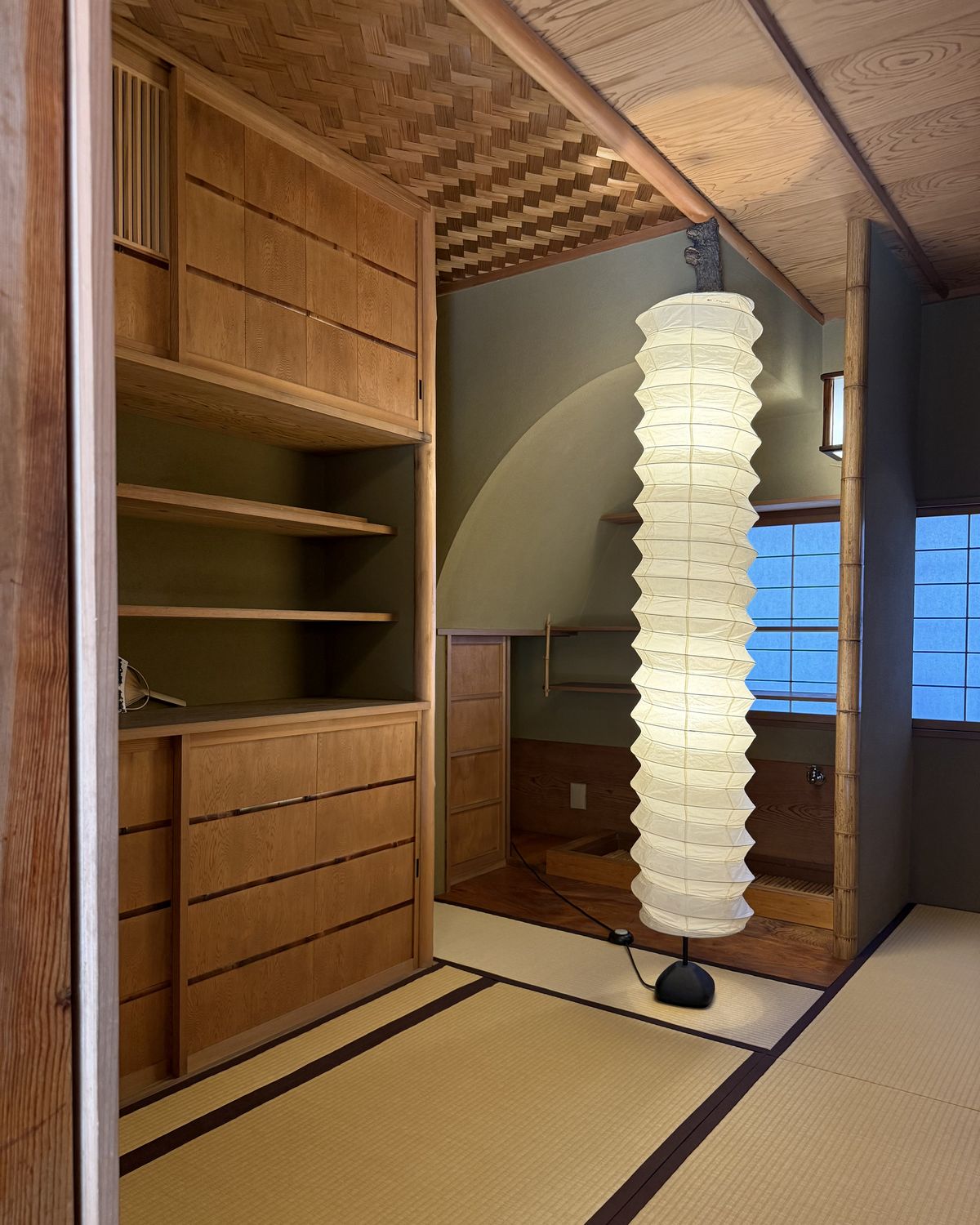 다다미가 깔린 1층의 다실에는 만듦새 좋은 몇 가지 가구와 이사무 노구치 조명이 자리하고 있는데요. 눈으로 둘러만 봐도 일본 사람들이 오랜 시간 동안 지켜온 미학인 와비사비 정신이 잘 느껴집니다.