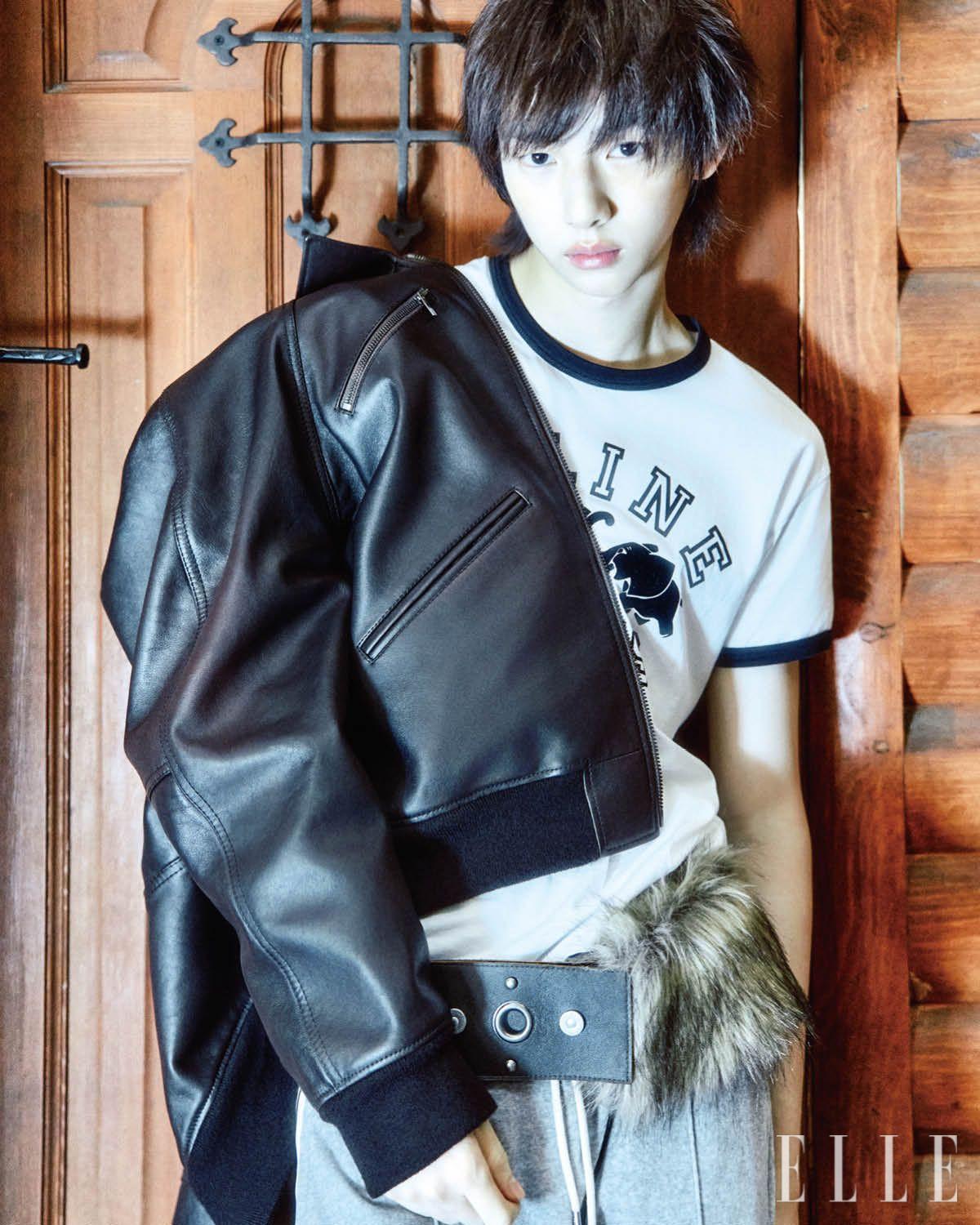 레더 블루종과 링거 티셔츠, 트랙 팬츠는 모두 Celine. 벨트는 스타일리스트 소장품.