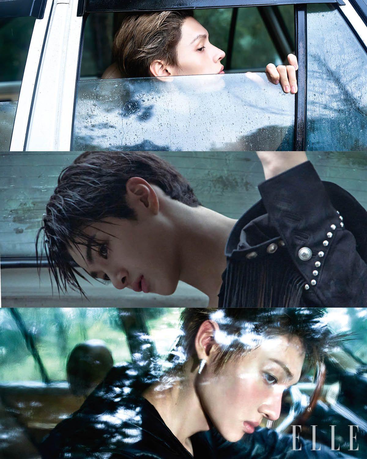 성현이 입은 아우터웨어는 Julius. 이너웨어 톱은 Didier wear. 이어 커프는 스타일리스트 소장품. 주훈이 입은 시어링 아우터웨어는 Rick Owens. 이너 웨어로 입은 티셔츠는 Eckhaus Latta.