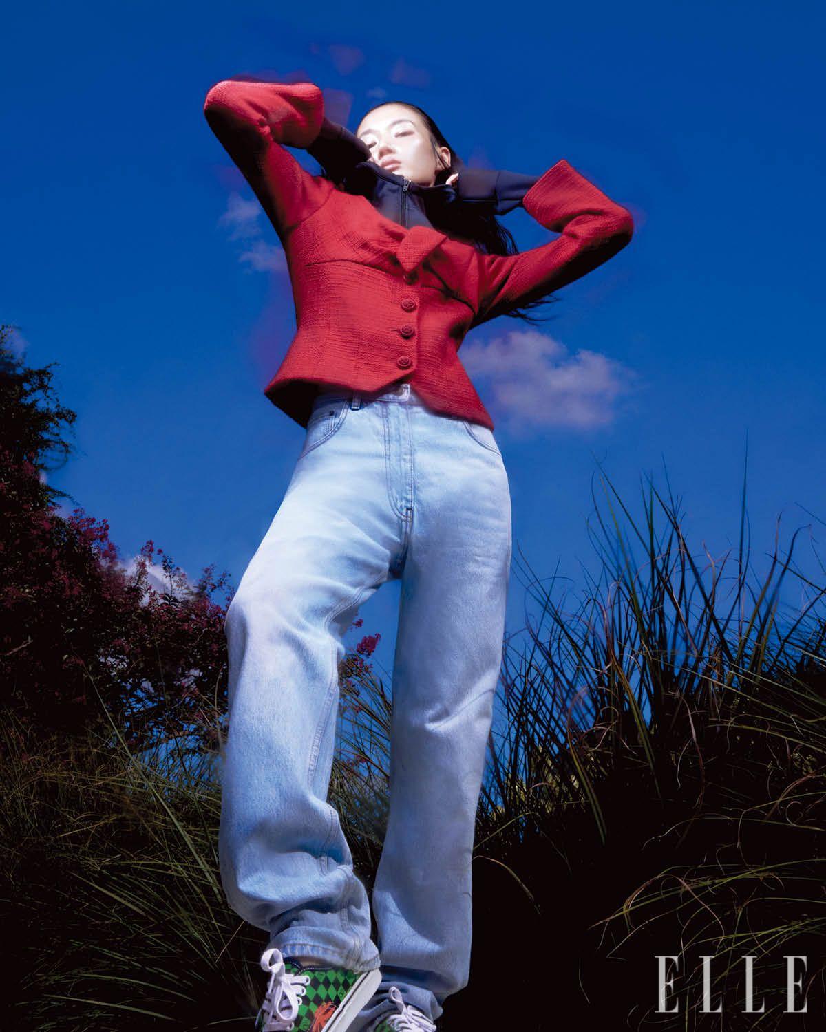 보 장식의 트위드 재킷과 저지 후디드 집업, 데님 팬츠는 가격 미정, 모두 Valentino. 스니커즈는 가격 미정, Valentino Garavani Collaboration with Vans.