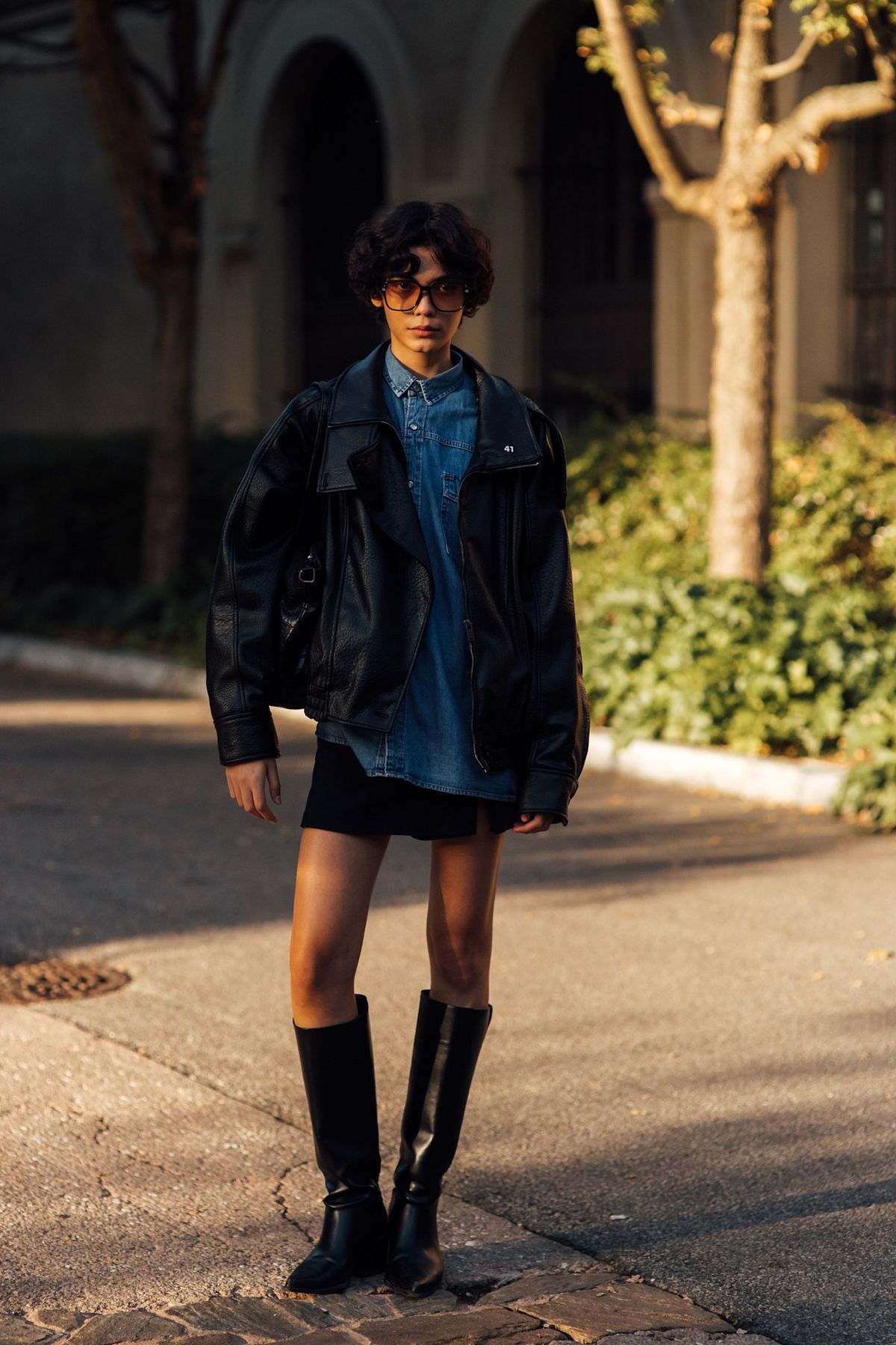 오버사이즈 아우터를 가장 쿨하게 즐기는 방법은 바로 대비입니다. 매니시한 아우터에 청바지 대신 미니스커트를 더해보세요. 길이의 대비에서 오는 시각적 긴장감이 룩을 훨씬 세련되게 만들어줍니다. 데님 셔츠로 캐주얼한 질감을 더하면 자칫 강해 보일 수 있는 인상을 한결 밝게 중화시켜줘요. 마무리는 니 하이 부츠. 도시의 낮과 밤, 어느 시간대에도 어울리는 ‘뉴 클래식 시티 걸’의 감성이 완성됩니다. 촌스럽지 않게 복고를 재해석하고 싶다면, 바로 이 조합이 정답입니다.
