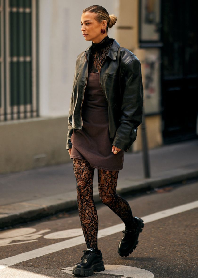 서로 다른 무드의 아이템이 만나면, 그 긴장감이 룩의 깊이를 만들어줍니다. 대표적으로 슬림한 데님 미니드레스에 매니시한 아우터를 더하는 순간이 있겠군요. 여기에 레이스 톱과 레이스 타이즈를 겹쳐 입으면, 시선을 빼앗는 반전의 한 수가 완성되죠. 발끝에는 청키 슈즈를 더해 매니시한 무게감을 유지하면서도, 레이스의 섬세함이 룩 전체를 부드럽게 감쌉니다. 이렇게 탄생한 룩은 도심 속 펑크 감성을 품은 모던 보헤미안이라고 해도 과언이 아니죠.