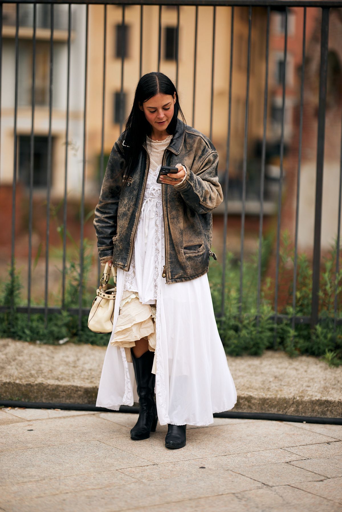 빈티지한 텍스처와 화이트 드레스의 조합은 늘 옳습니다. 시간의 흔적이 느껴지는 아이템과 순수한 실루엣이 만나면 룩에 서사가 생기죠. 마치 오래된 영화 속 주인공처럼 자유롭고 낭만적인 에너지가 피어오릅니다. 여기에 내추럴한 웨이브 헤어와 미니백을 더하면 감각적인 여유가 완성되죠다. 거칠고 강한 소재도, 이렇게 스타일링하면 부드러운 감성으로 전환되죠. 이번 시즌, 진짜 멋은 세련된 자유로움에 있다는 사실을 기억하세요!
