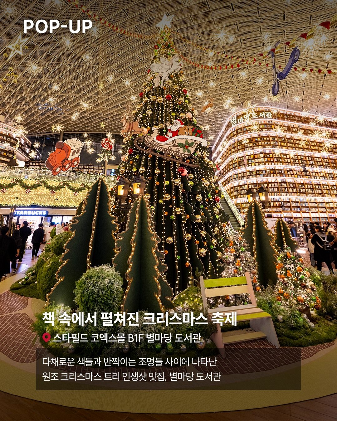 도심 곳곳에도 연말 분위기를 만끽할 만한 명소가 많습니다. 크리스마스트리 명소로 유명한 스타필드가 대표적인데요. 이에 따르면 올해 스타필드 코엑스몰 별마당 도서관은 '책 속에서 펼쳐지는 크리스마스 축제'를 테마로, 환상적인 동화 속 세상으로 변신했다는군요. 책을 사랑하는 소년이 할머니의 오래된 책을 펼치며 시작되는 스토리텔링 구조에 빛과 음악, 향기가 다채롭게 어우러져 오감을 자극하는 게 특징. 종이에 새해 바람을 적어 위시 트리에 걸거나 가져갈 수 있는 '위시 포레스트존'이 마련된 것도 인상적입니다.