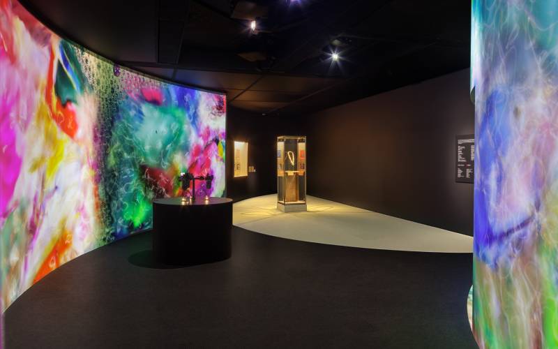 ‘살아 있는 회화’처럼 액체와 소리, 고체 안료가 실시간으로 반응하고 결합된 설치 작품이 불가리 헤리티지 컬렉션과 어우러져 변화하는 색채의 본질을 표현한다.