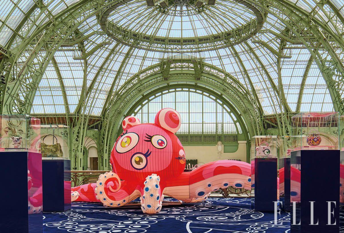 파리 그랑 팔레에서 열린 아트 바젤 파리. 이번 시즌, 루이 비통이 스포트라이트를 비춘 주인공은 무라카미 다카시였다. 그의 독창적 감성을 담아 완성한 ‘아티카퓌신 VII - 루이 비통 × 다카시 무라카미(Artycapucines VII - Louis Vuitton × Takashi Murakami)’ 컬렉션이 공개됐기 때문이다. 1990년대 이후 무라카미는 전통 일본 미술과 애니메이션, 팝 컬처를 경쾌하게 결합하며 독보적인 세계관을 구축해 왔다. 그리고 약 20년 만에, 루이 비통과의 상징적인 협업이 다시 한 번 현실이 됐다. <엘르> 코리아는 프리뷰 기간 중 누구보다 먼저 현장을 찾았다. 아트 바젤의 입구를 지나면 가장 먼저 시선을 붙잡는 곳은 웅장한 발콩 도노르(Balcon d’Honneur). 무라카미는 이 상징적 공간을 대규모 설치미술 작업으로 새롭게 변모시켰다.
